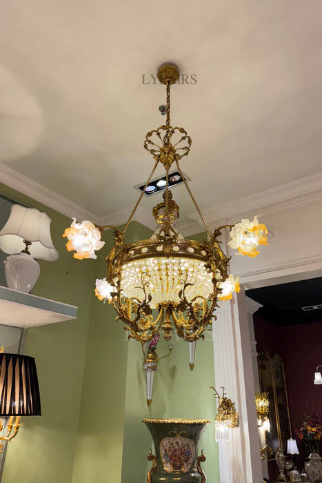 LYFAIRS x FH&Home Baroque Floral Glass Brass Chandelier with Porcelain Bottom