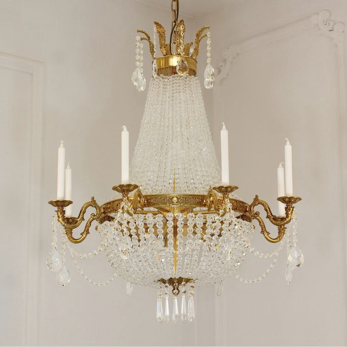 8/12/15 Lights Decorative Empire Brass Candles Crystal Chandelier Romantic Foyer Living Room Ceiling Light Fixture in Pure Copper Finish