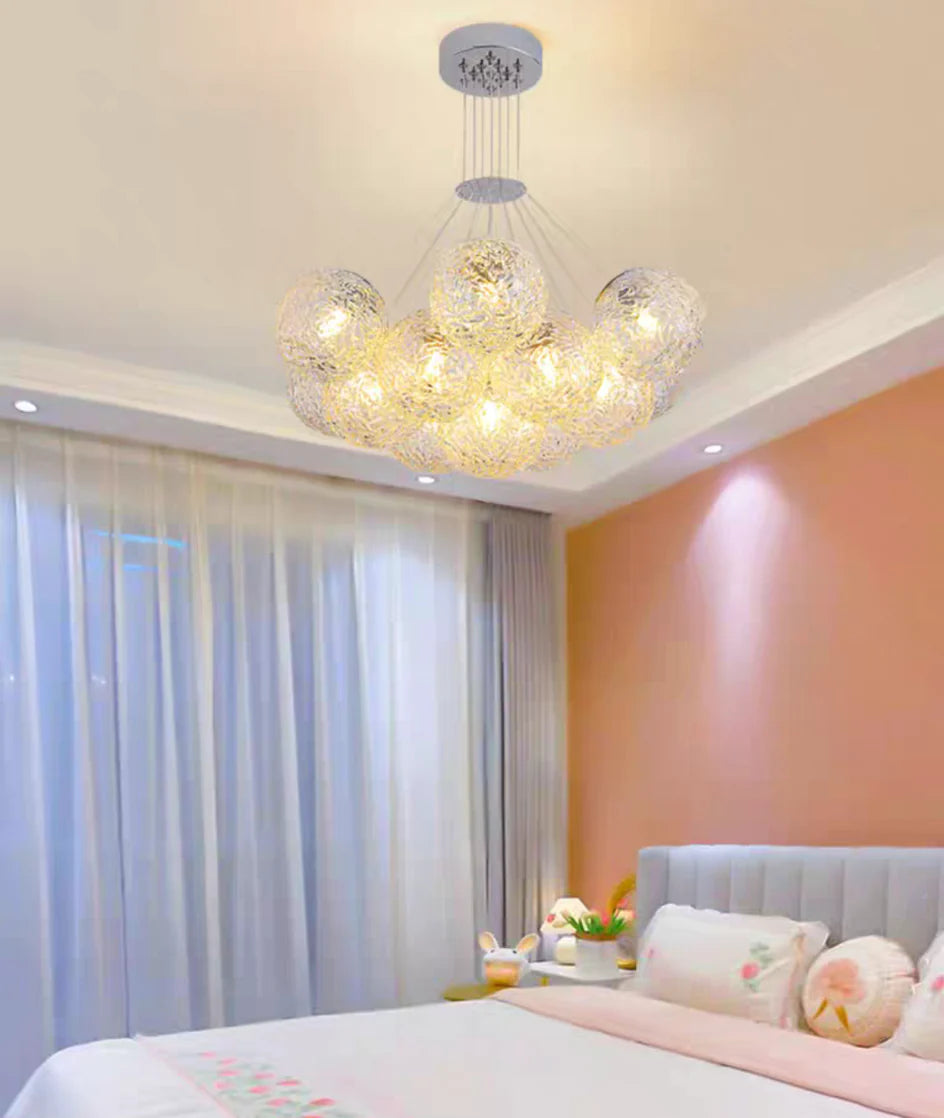 The body of this chandelier is made of iron and glass materials.Like a balloon hanging from the ceiling, the watery design of the glass shade wraps around the LED light source, creating a fairy and gentle aesthetic that is dreamy and romantic. In the form of bubbles, this chandelier emits an incredibly warm, atmospheric glow in your space.It is absolutely stunning whether the lights are on or off.Perfect for living rooms, dining rooms, bedrooms, lofts, duplexes or commercial areas.