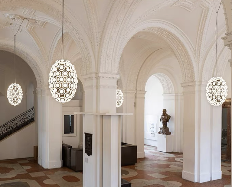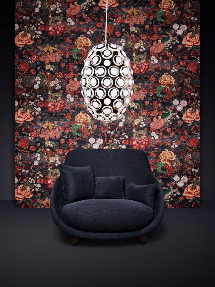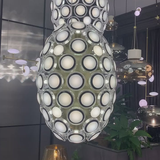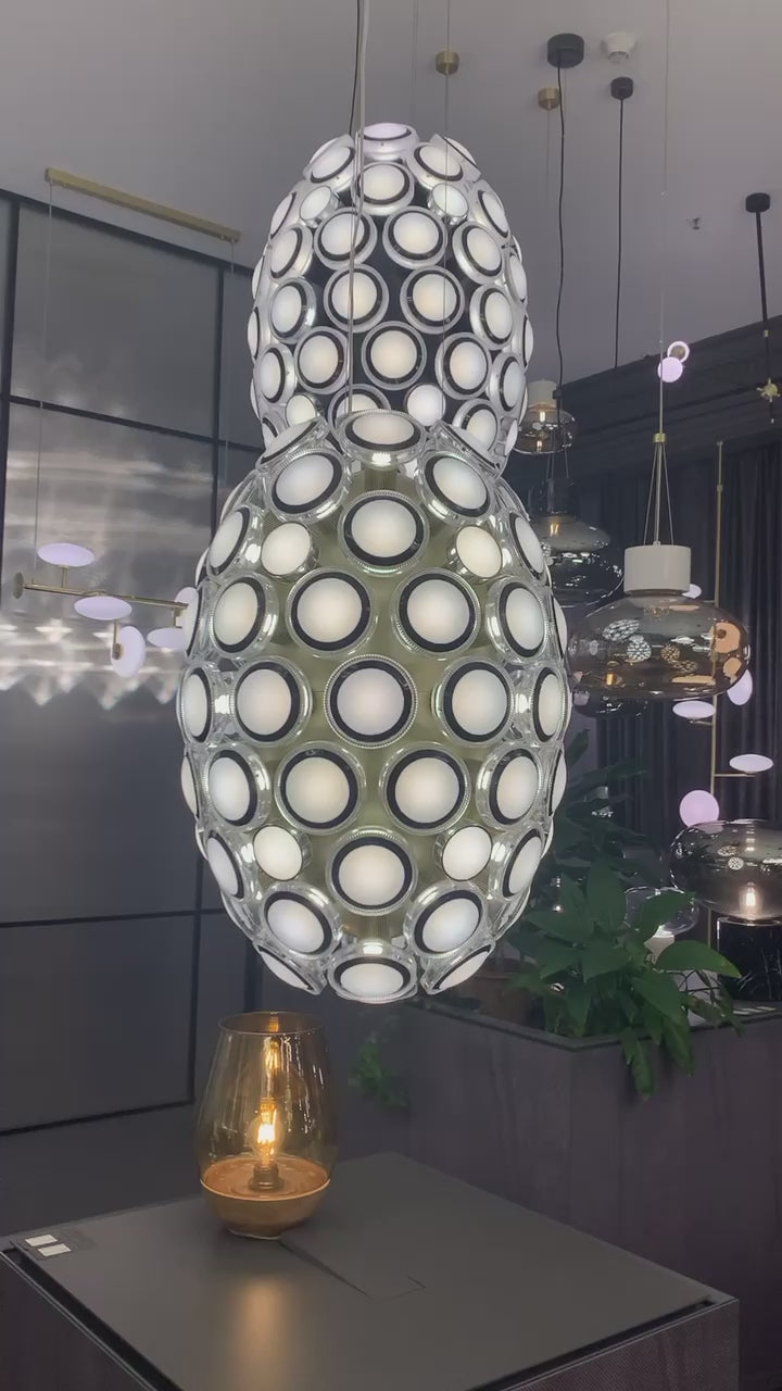 This huge egg-shaped art chandelier, known as the iconic eye, the design of this lamp is inspired by the appearance of the BMW Mini headlights, the classic color scheme of white and black, like people's eyes, the lamp is covered with frosted glass peepers inside a chrome ring, each lit by a single LED, the texture and design of this lamp is stunning.Perfect for living room,dining room,hallway,coffee shop,etc.