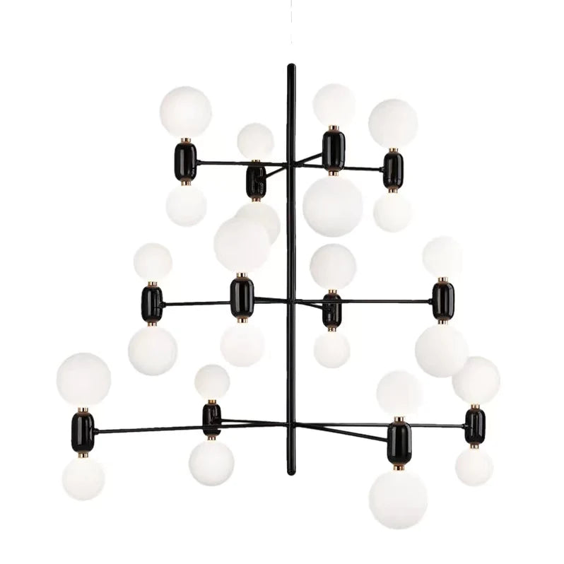 This minimalist chandelier consists of an array of individual LED lights mounted through an artistic ceramic base with a mouth-blown glass diffuser. Available in a variety of colors: white or black lacquer, or plated gold, copper or chrome lacquer with a ceramic base in the same shade. Ideal for installation in the living room/bedroom/dining room, etc..