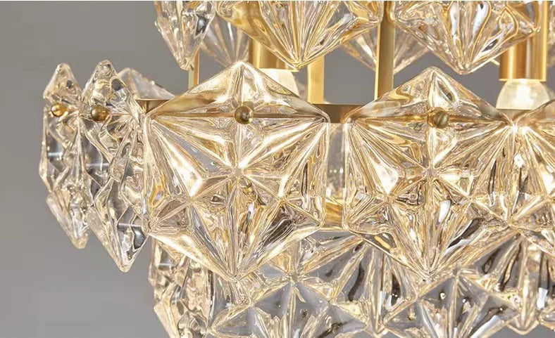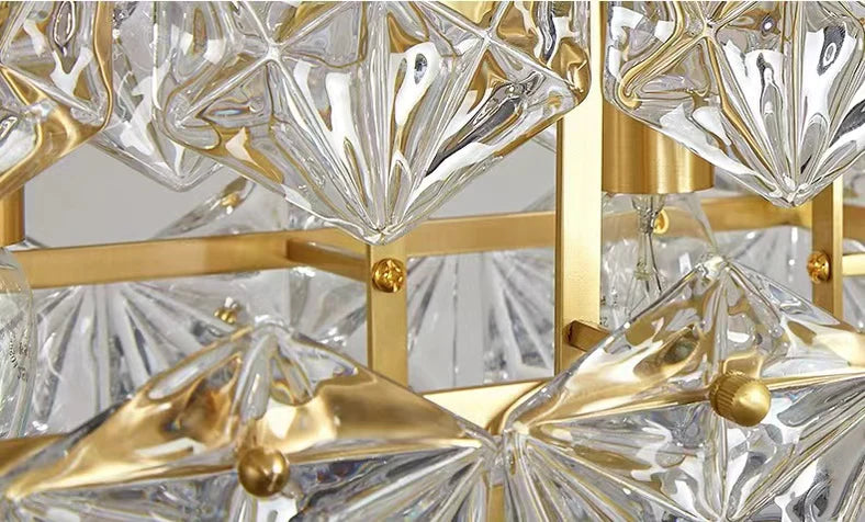Made of brass and high quality crystal, this sculptural chandelier takes the geometry of the classic chandelier silhouette and turns it into a diamond-like hexagonal crystal unit. Polished golden brass as the primary material guarantees high quality corrosion and rust resistance to support long-term use. Used individually, or by grouping several items into one large chandelier, the faceted components appear clear, regular and geometric. Perfect for long dining tables, kitchen islands, water bars, etc.