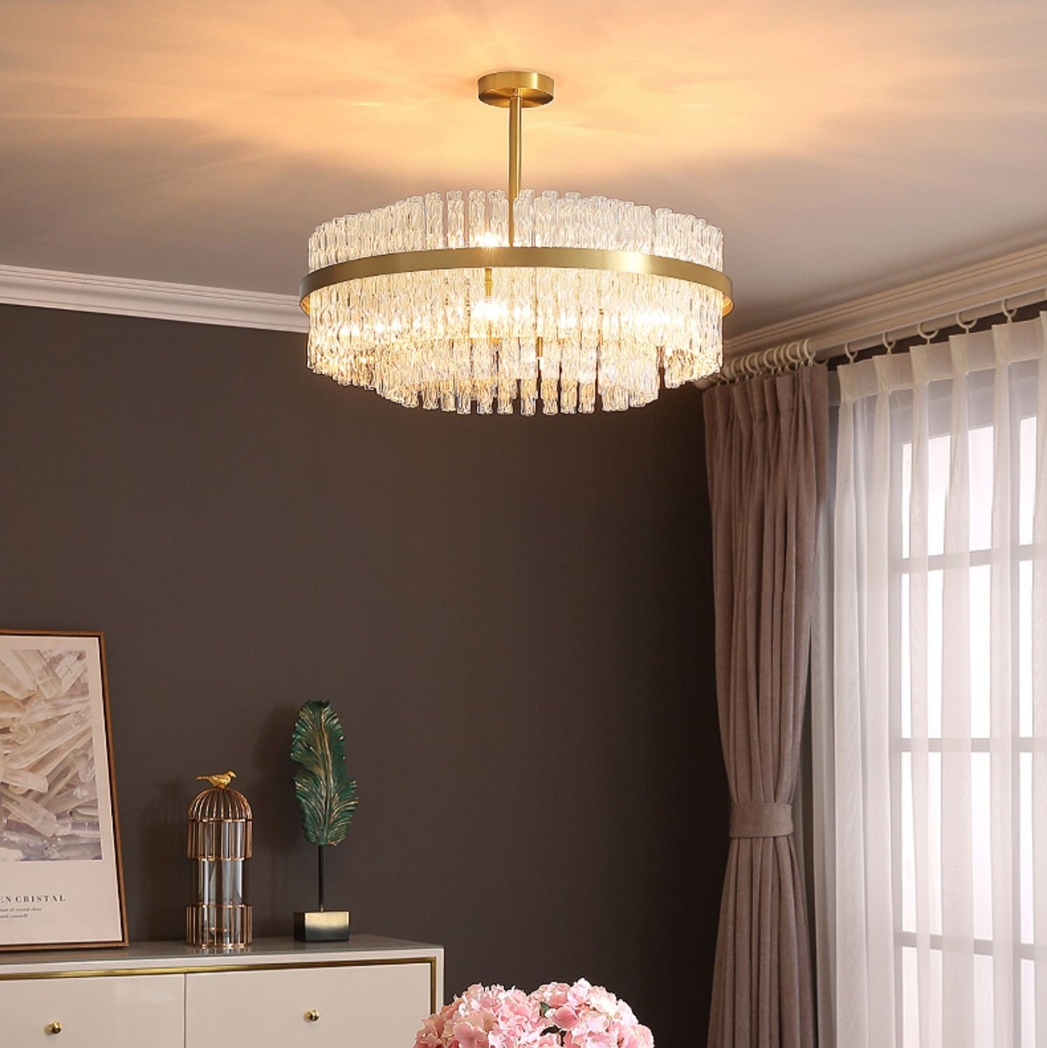 The whole light body is made of high-quality crystal and brass. It is designed into a luxury modern style. It is absolutely stunning no matter light turns on or not.