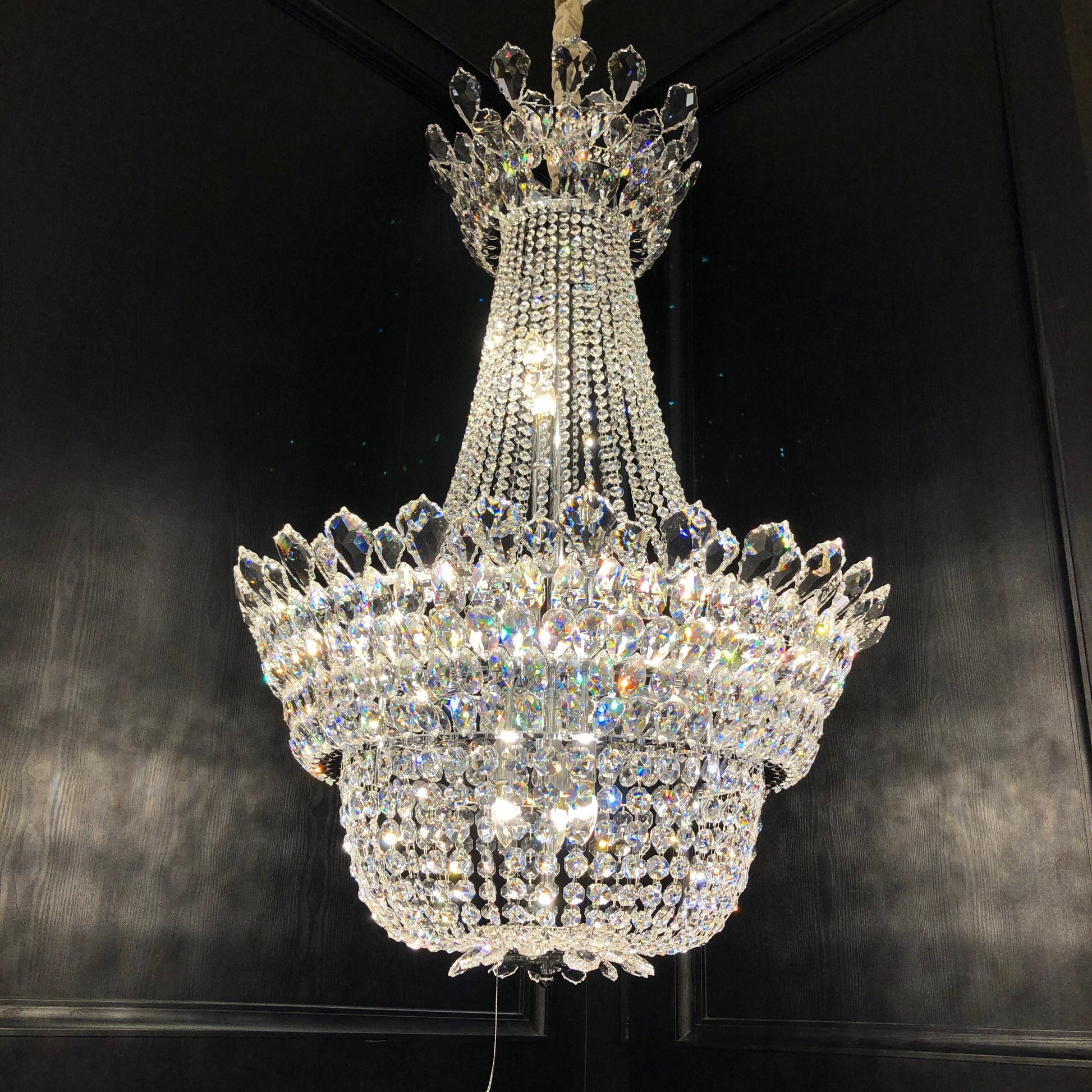 This empire chandelier features a pendant design with crystal and a polished silver finish frame. The whole light has a clean line sense, fanciful beads, dainty droplets, and antique nostalgic ovals woven into chains creating a jewel-like brilliance. Decorated crystal slices like branches that stick out, adding an additional layer of extension and pullulation.