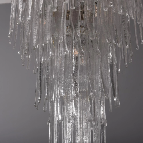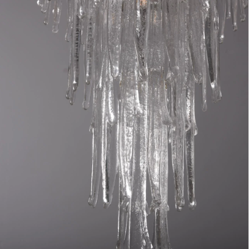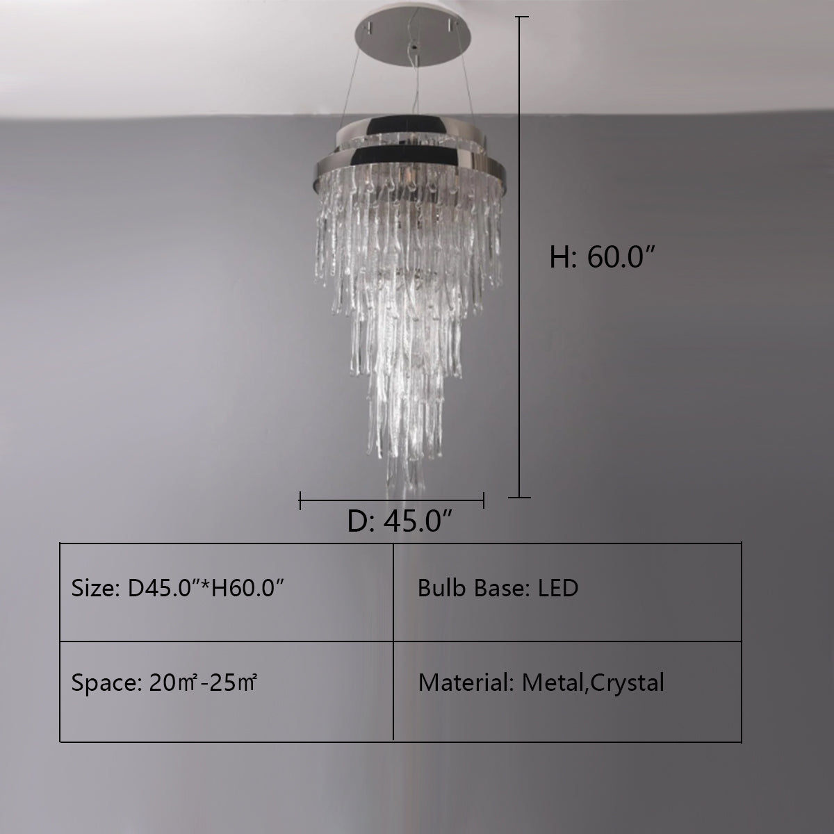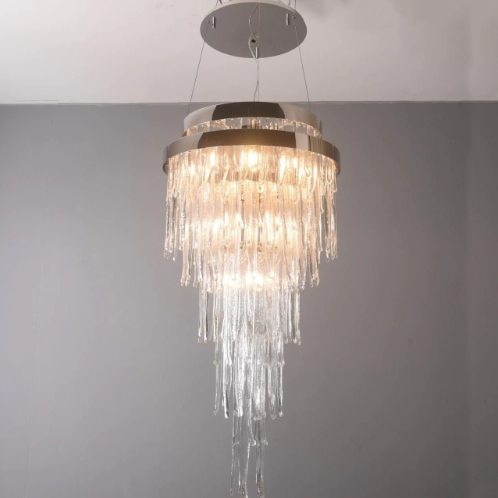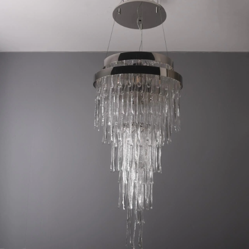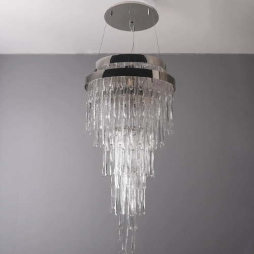 This chandelier is made of high quaity crystal and metal.It features multiple layers of oversized chandeliers with crystals hanging down in layers,like a spectacular waterfall.Ideal for installation in oversized living rooms with high ceiling.It is absolutely stunning whether the light is on or off.