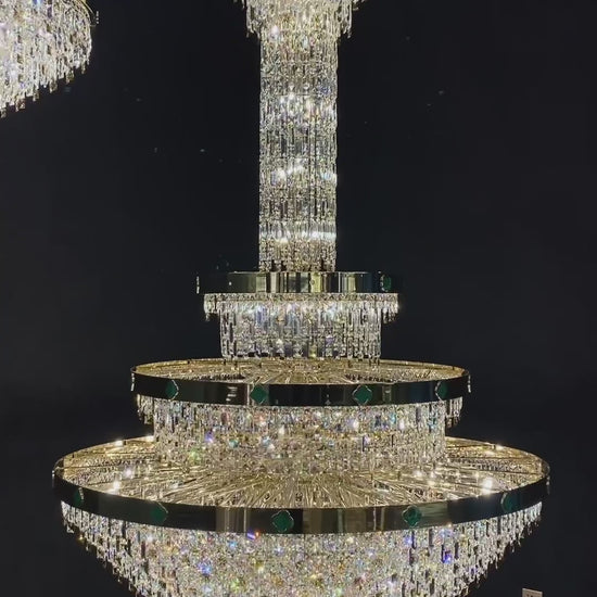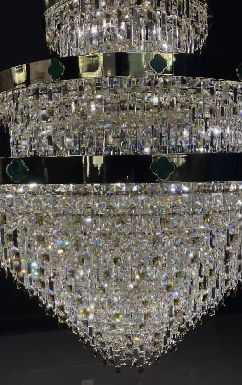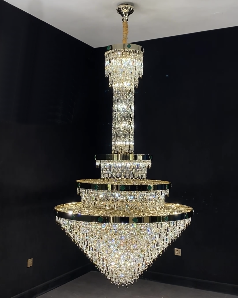 The European Empire style crystal chandelier is a work of craftsmanship and beauty. This chandelier consists of two parts: the upper part is a myriad of rectangular crystal rods arranged in a regular pattern like a long neck; the lower main part resembles a huge crystal bowl or a layered inverted dome, trimmed with metal rings as a frame. Once you see this crystal chandelier online, you will fall in love with it, even more so when it is installed in your staircase, hallway, duplex, attic or villa.