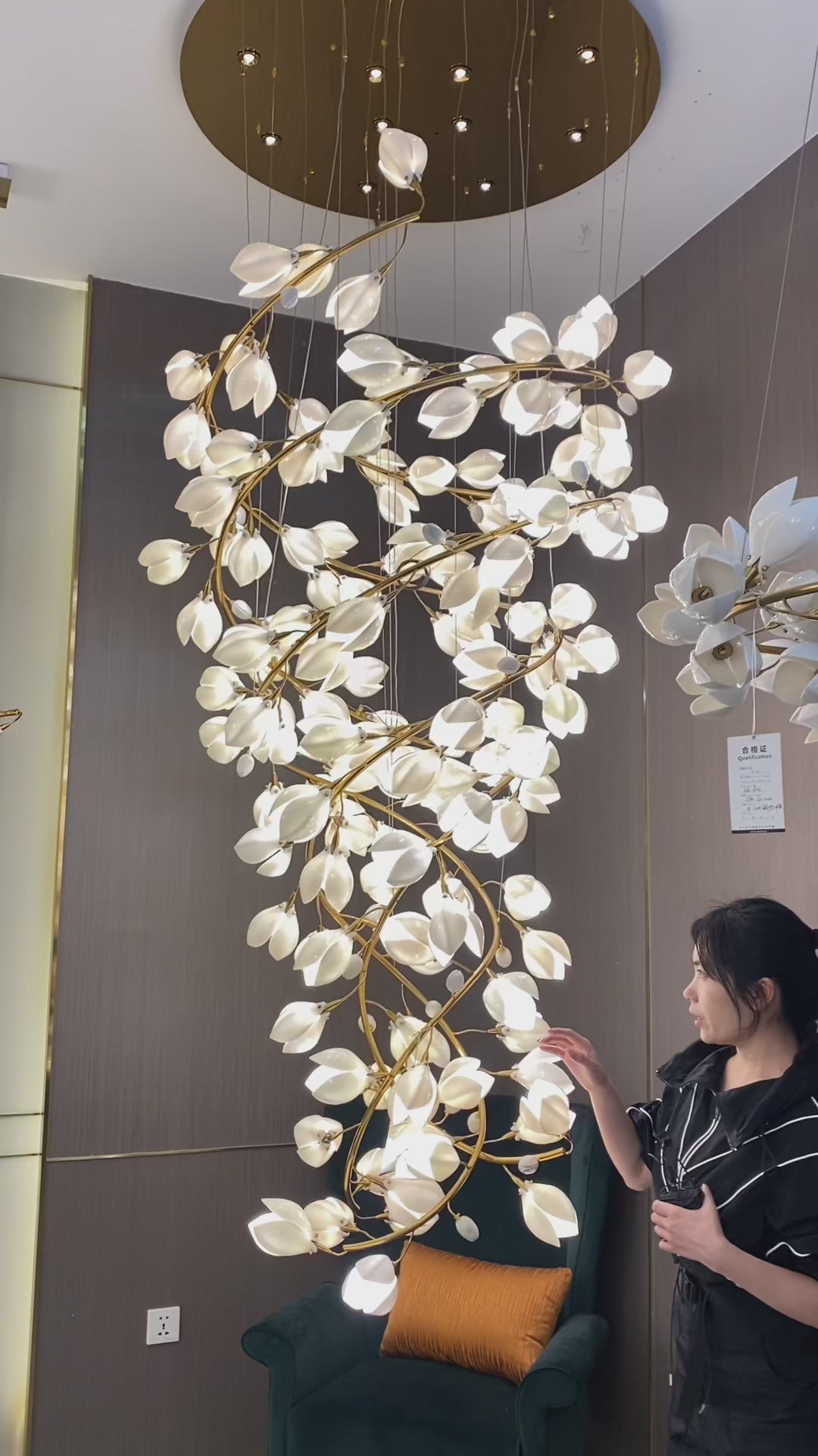 This oversized chandelier hangs from the ceiling like a cluster of magnolias, with flowers extending from mock spiral branches in a pure white color for an atmosphere of sophistication and pure romance. Each magnolia flower contains a single bulb that diffuses and softens the lighting in a gentle way. Perfect for installation in living room, foyer, entry, stairs, etc.