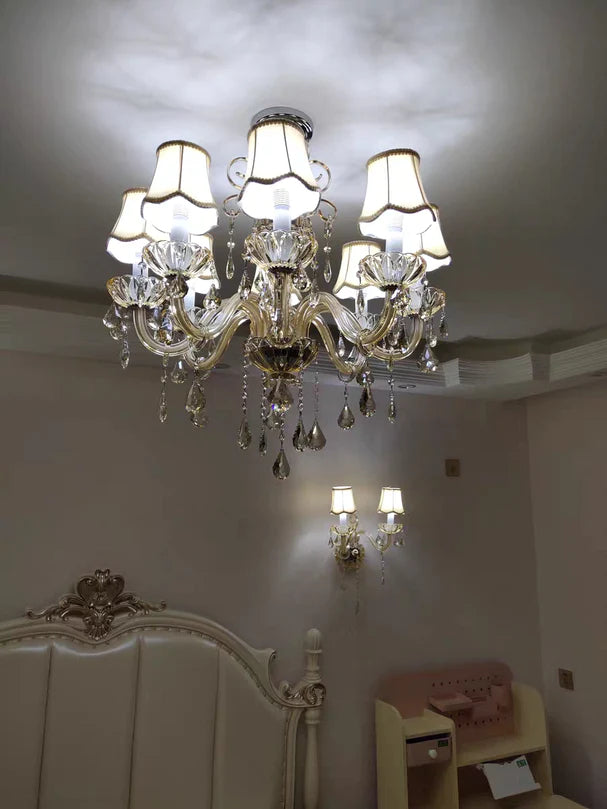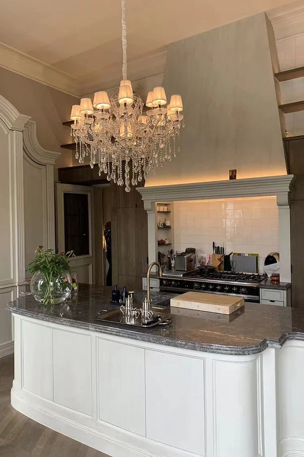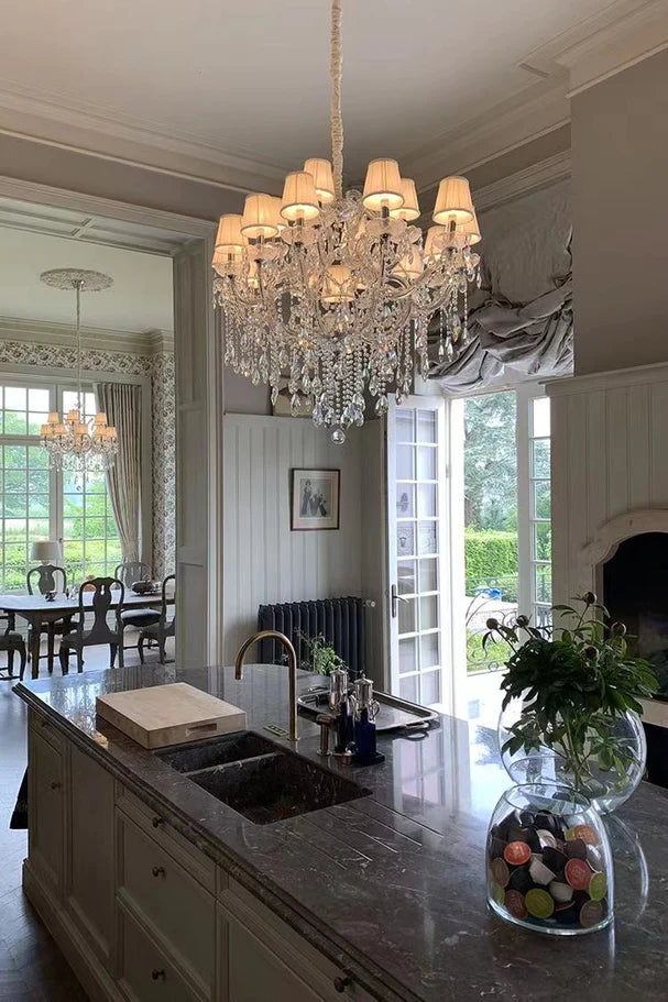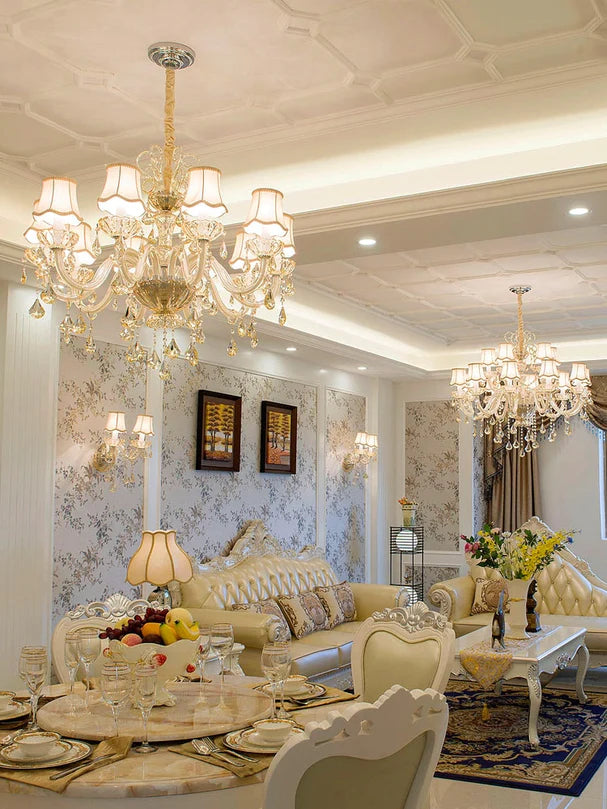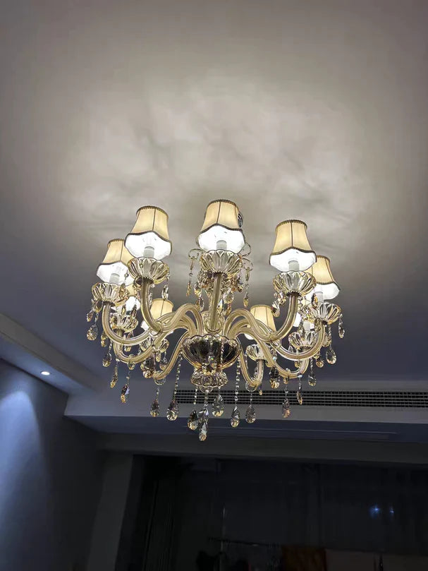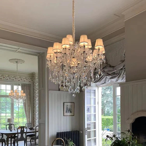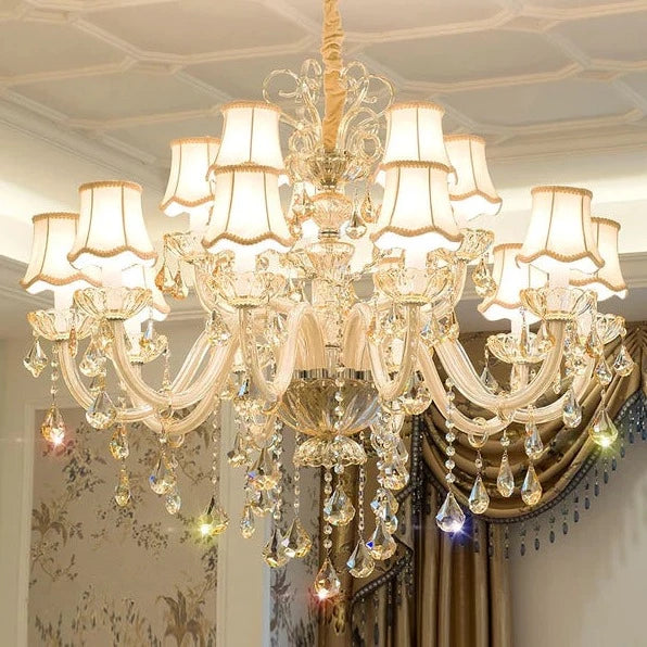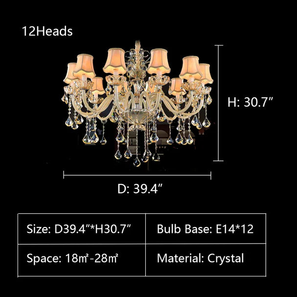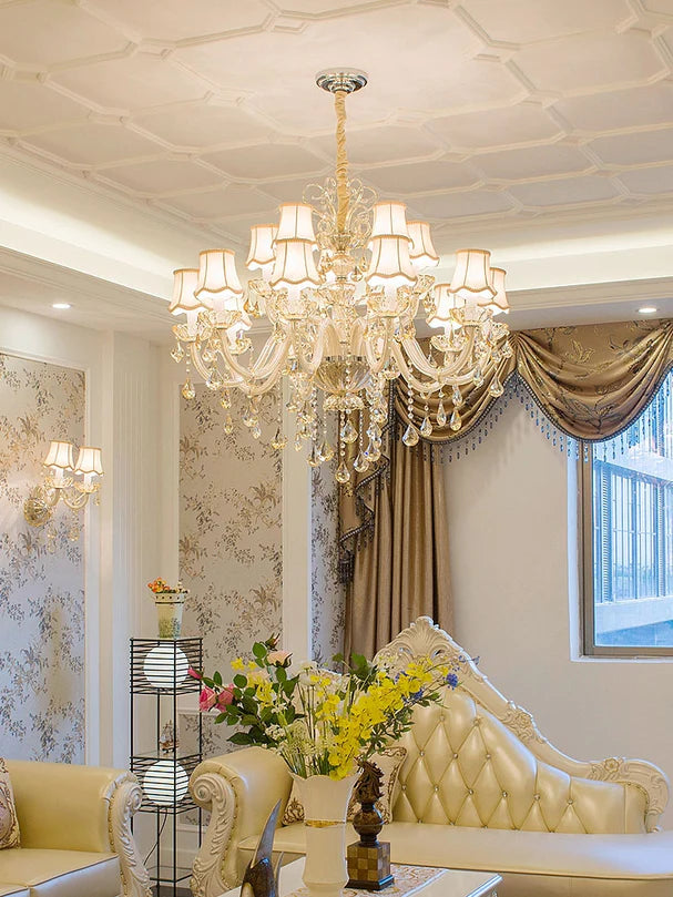 This Extra Large Luxury Multi-Tiered Crystal Candle Chandelier is crafted with robust K9 crystal. With its luxury style chandelier design, this piece of art boasts bell-shaped shades placed on crystal arms adorned with floral disc cups and hanging teardrop pendants. Perfect for high ceilinged rooms, staircases, grand living areas, and commercial spaces, it emits a sparkling shimmer that is truly captivating whether the light is on or off.