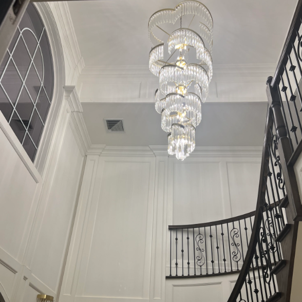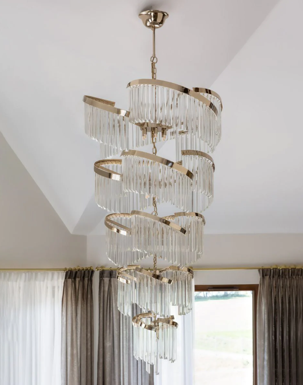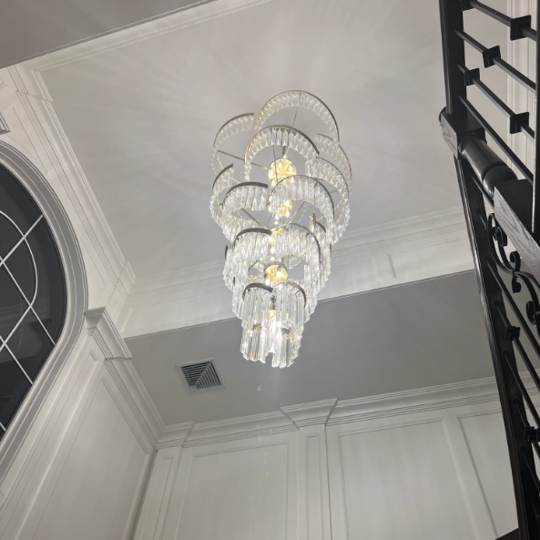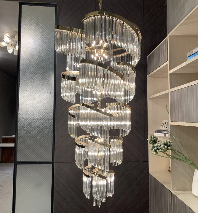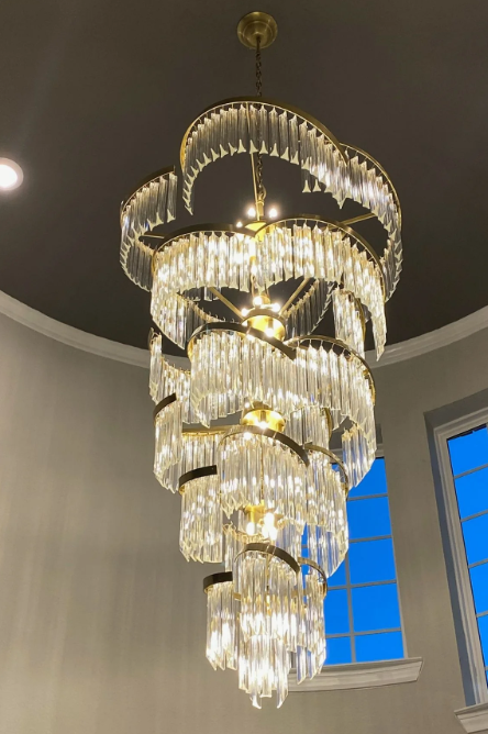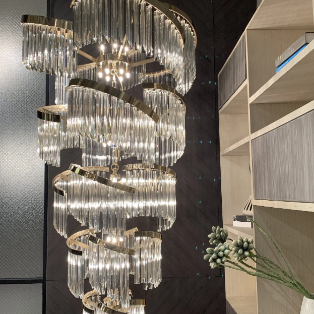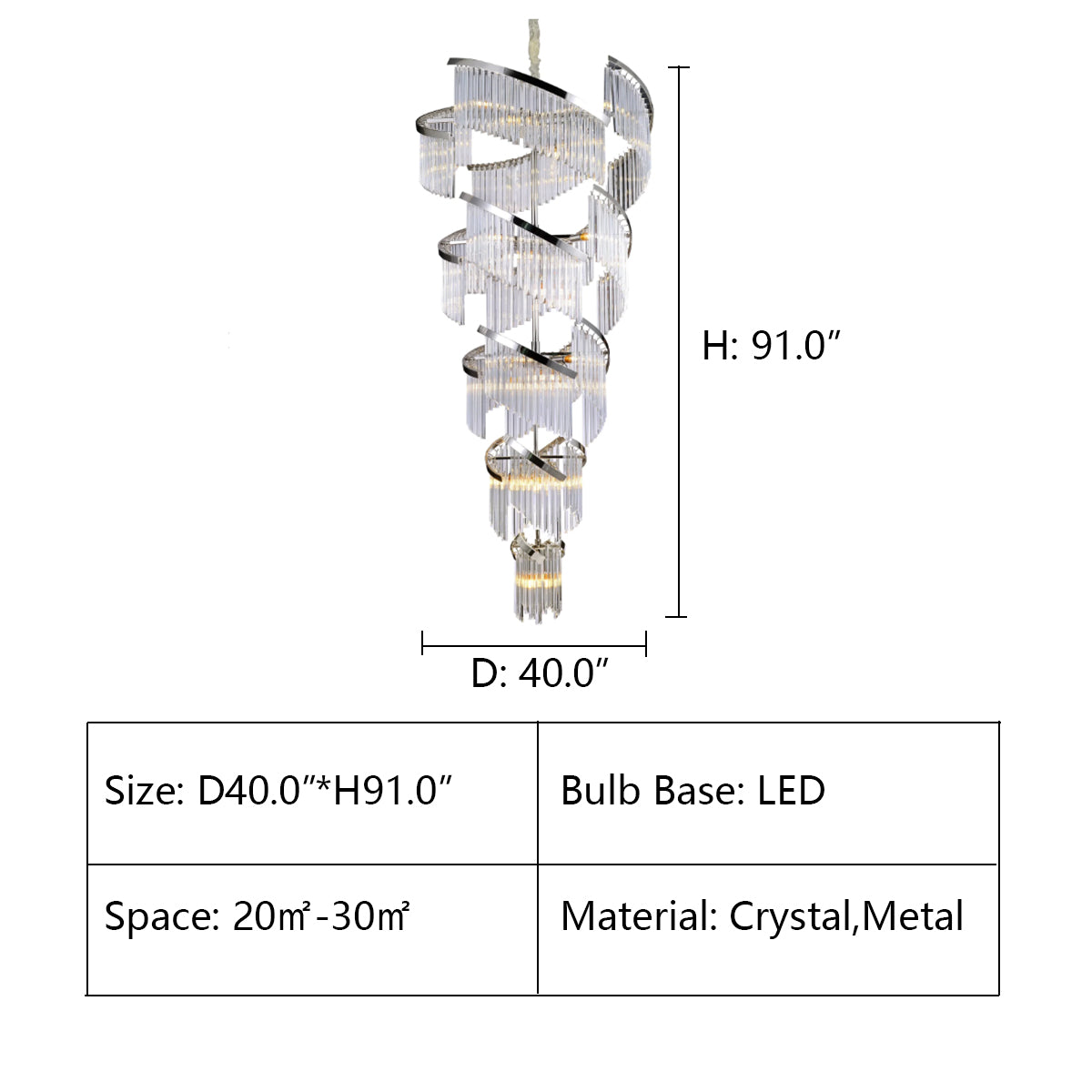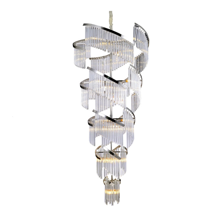 This chandelier is made of high quality crystal and metal metiral.It combines the elegance of a traditional spiral design with the sleekness of a post-modern fixture, featuring a series of matte crystal rods on a stainless steel frame. The sloping form gives the chandelier its curvaceous beauty and ethereal feel. A dozen lights are hidden within, providing soft but still rich illumination of the space through hazy glass. It's the perfect home accent for foyers and high ceilings, and it's absolutely stunning whether the lights are on or off.