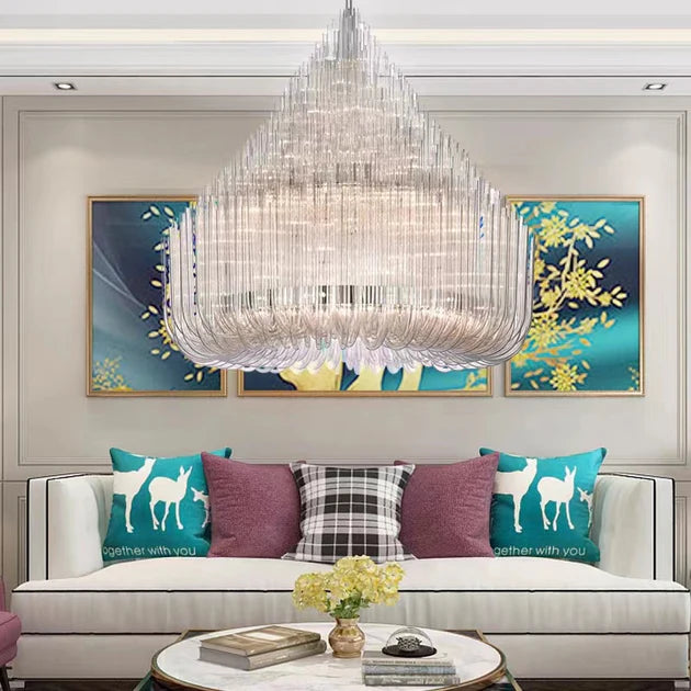 Introducing our Extra Large Modern Tiers Clear Glass Tubes Chandelier, perfect for any living room or hotel lobby. This innovative design brings both creativity and modern style to your space, adding a touch of sophistication and elegance. Elevate your room with our stunning chandelier and make a bold statement.