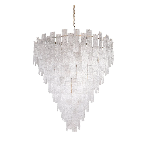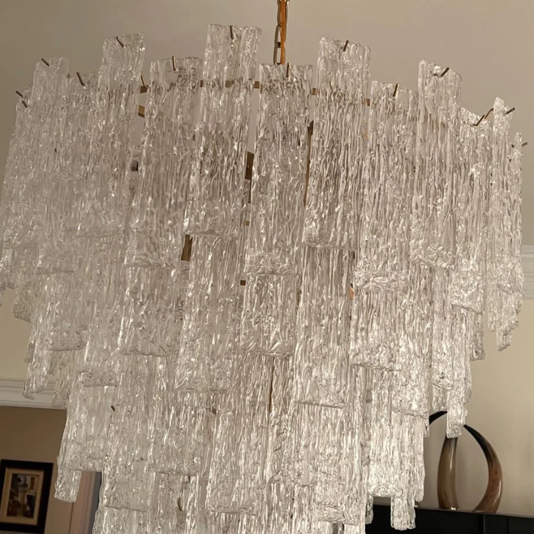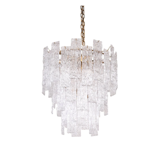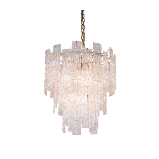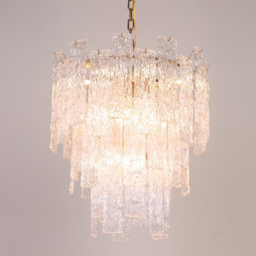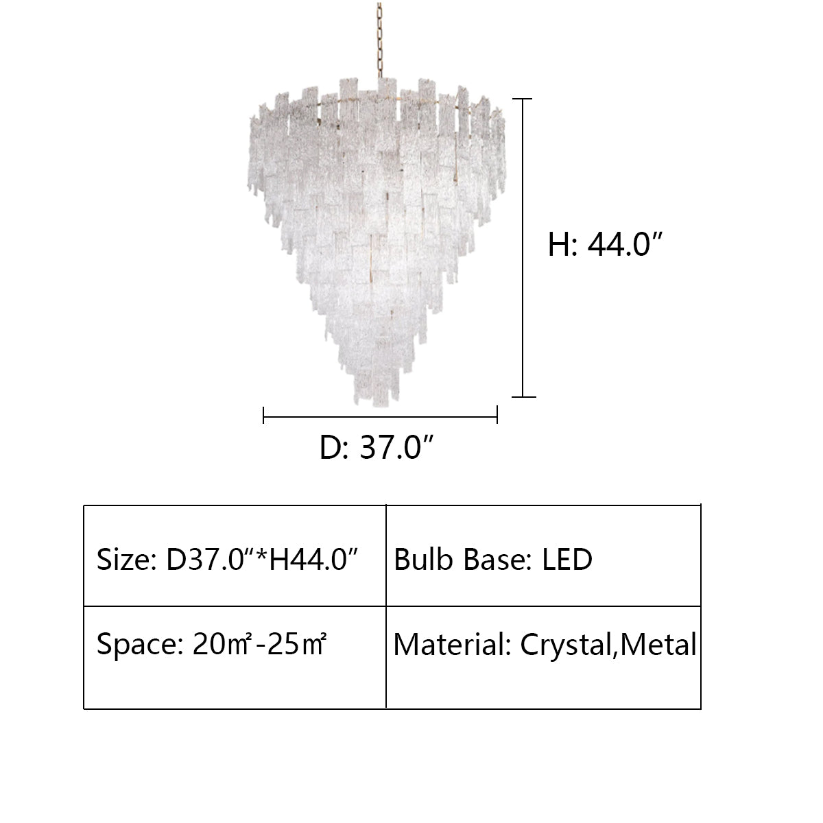 This chandelier is made of high quality crystal and metal material.It features a patterned crystal sheet stacked in interlocking layers to form an inverted cone shape,showcasing a complex aesthetic.It is absolutely stunning whether the light is on or not.Perfect for installation in living room,foyer,entryance,etc.
