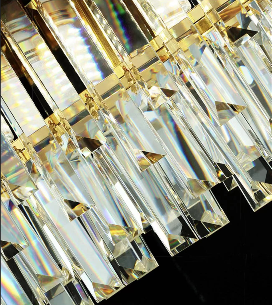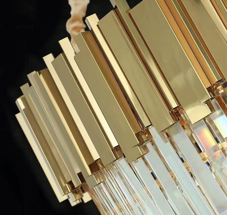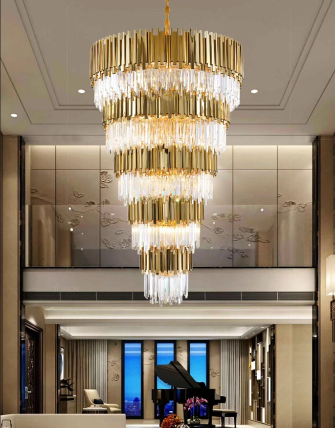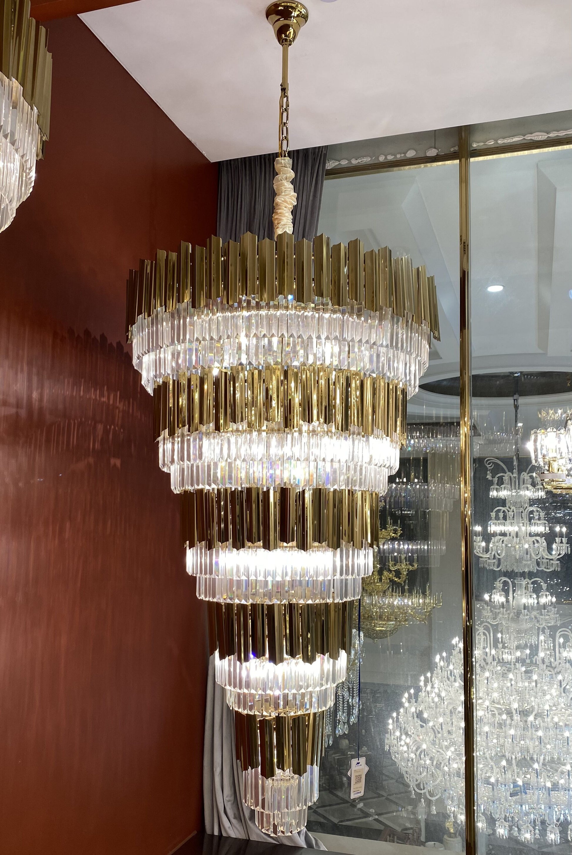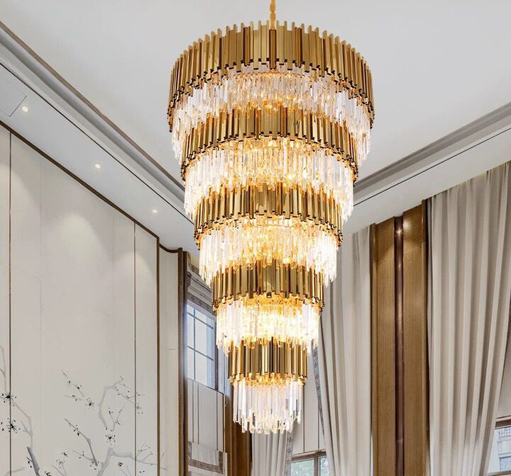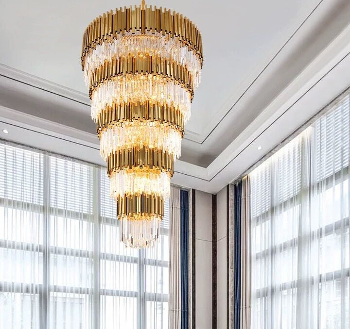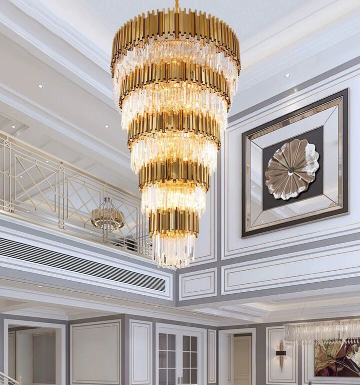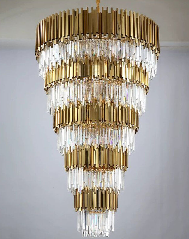 Multiple layers of metal mixed with crystal resemble an upside down cake. The extra large size requires a high ceiling space and is sparkling from every angle and absolutely stunning when the lights are switched on. The electroplated stainless steel material and sparkling K9 crystals give this artefact a consistently good shine and a rich colour whose colour never fades. Ideal for large staircases, large living rooms, duplexes, luxurious 2-storey lofts, entrances, lavish dining rooms and hotel lobbies.