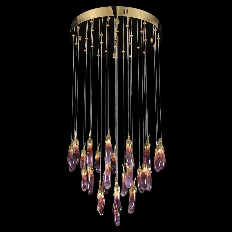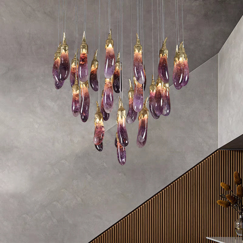 This creative chandelier has an unusual shape, with natural crystal stones designed in the shape of a purple aubergine in a stunning gradient of purple. The brass material used to decorate the top of the crystal is a luxurious and vivid combination of gold and purple that you are sure to fall in love with. Perfect for installation in living room, dining room, foyer, stairs, hallway, etc.
