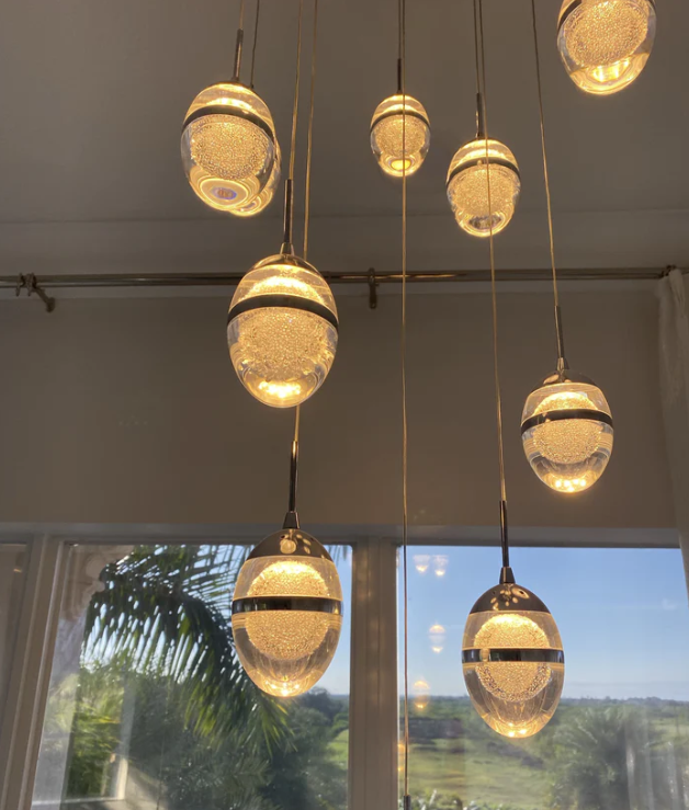 This chandelier is made of glass and metal. It has been designed in a unique shape with an oval glass shade containing many bubbles and is decorated with a metal ring in the centre. The bubble glass is fantastic and clear. The light transmission is even and soft, without harshness, bright and comfortable. It gives an elegant, non-traditional, romantic style that adds dimension to the visual. Whether as a decorative piece or a lighting fixture for stairwells, it makes a statement. Perfect for staircases, high walled rooms, hotel lobbies, etc.
