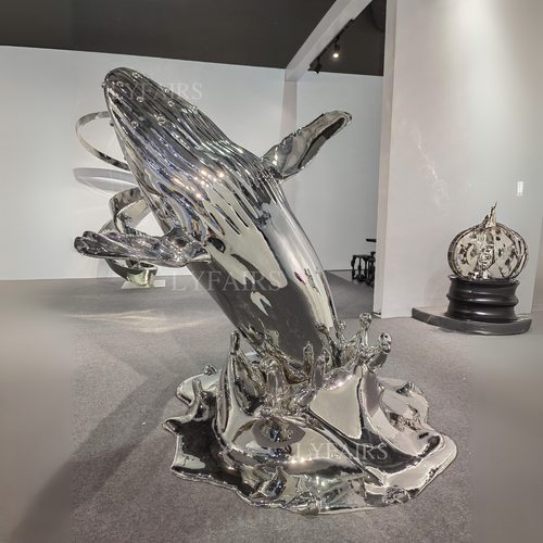 Graceful Whale Emerging from Ocean in Shimmering Stainless Steel Sculpture