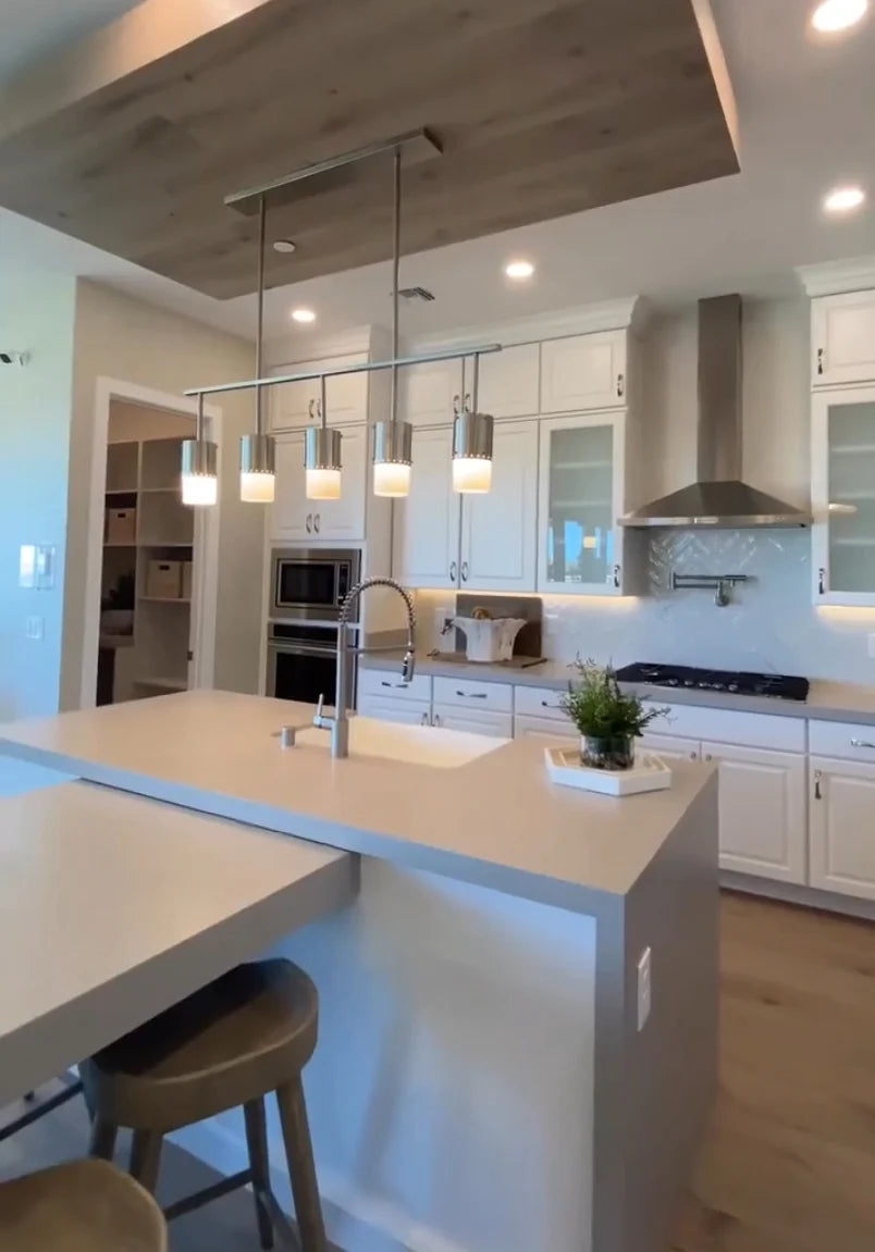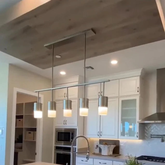 This Industrial Antique Silver 5-Light Chandelier is a perfect patina on antique silver metal that brings a little warmth to the crisp white glass shades. At 50" wide, this industrial glam fixture adds style to length, perfect above any dining room table.