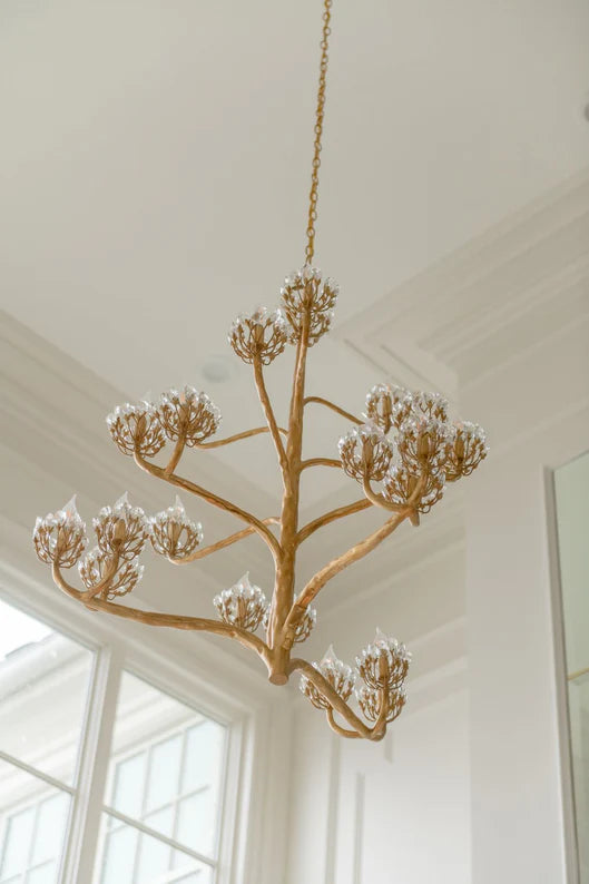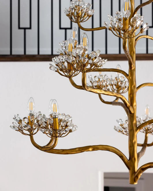 Illuminate your space with our Luxury Branch Flower Gold Chandelier. Inspired by the Century plant, this grand light fixture features 22 lights surrounded by sparkling crystal clusters. The dark contemporary gold leaf finish adds a touch of elegance. Perfect for living rooms, staircases, and bedrooms.