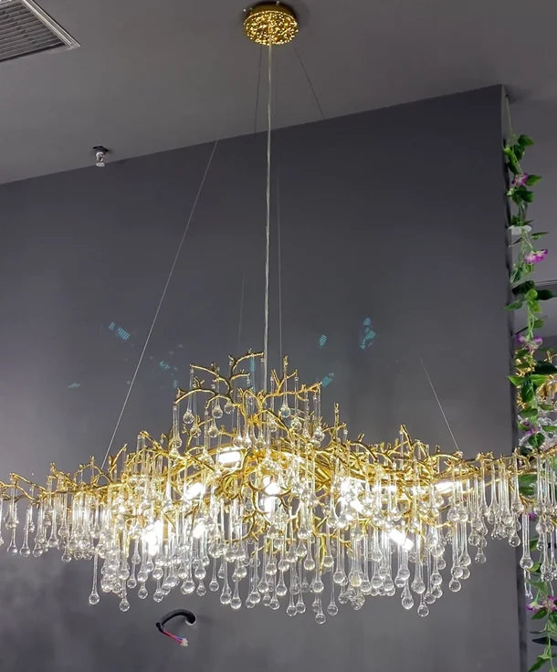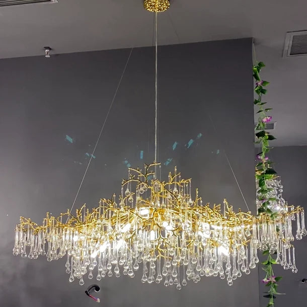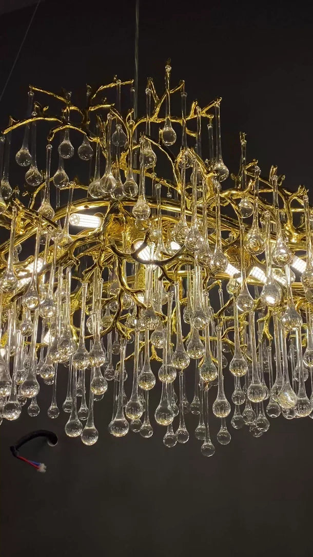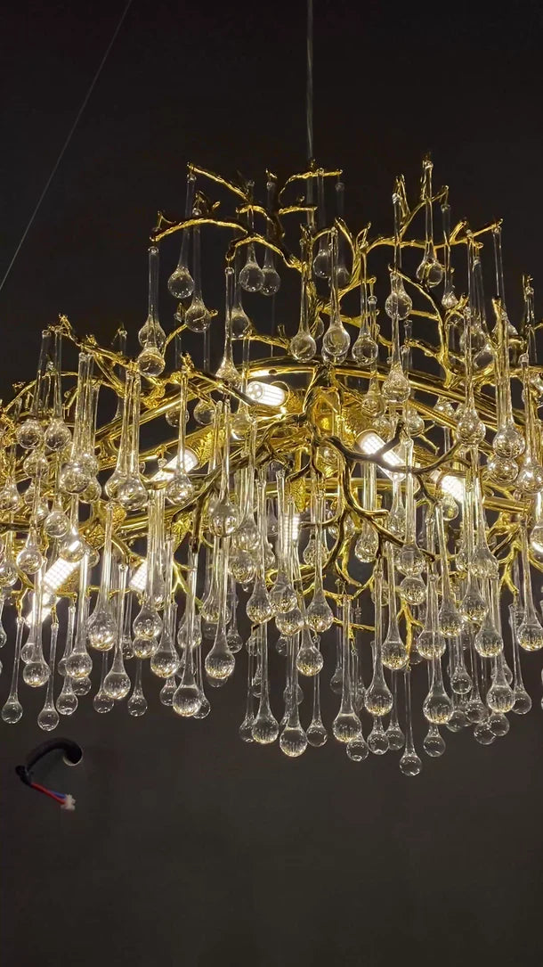 Elevate your dining room or kitchen island with our Luxury Gold Crystal Raindrop Chandelier. The stunning design features cascading crystal drops for a touch of opulence and elegance. Create a luxurious atmosphere with this statement piece that adds just the right amount of sparkle and glamour to any space.
