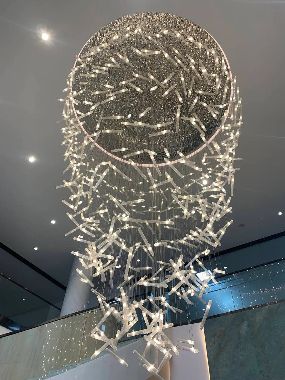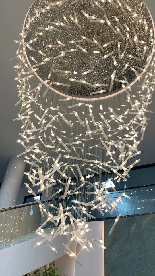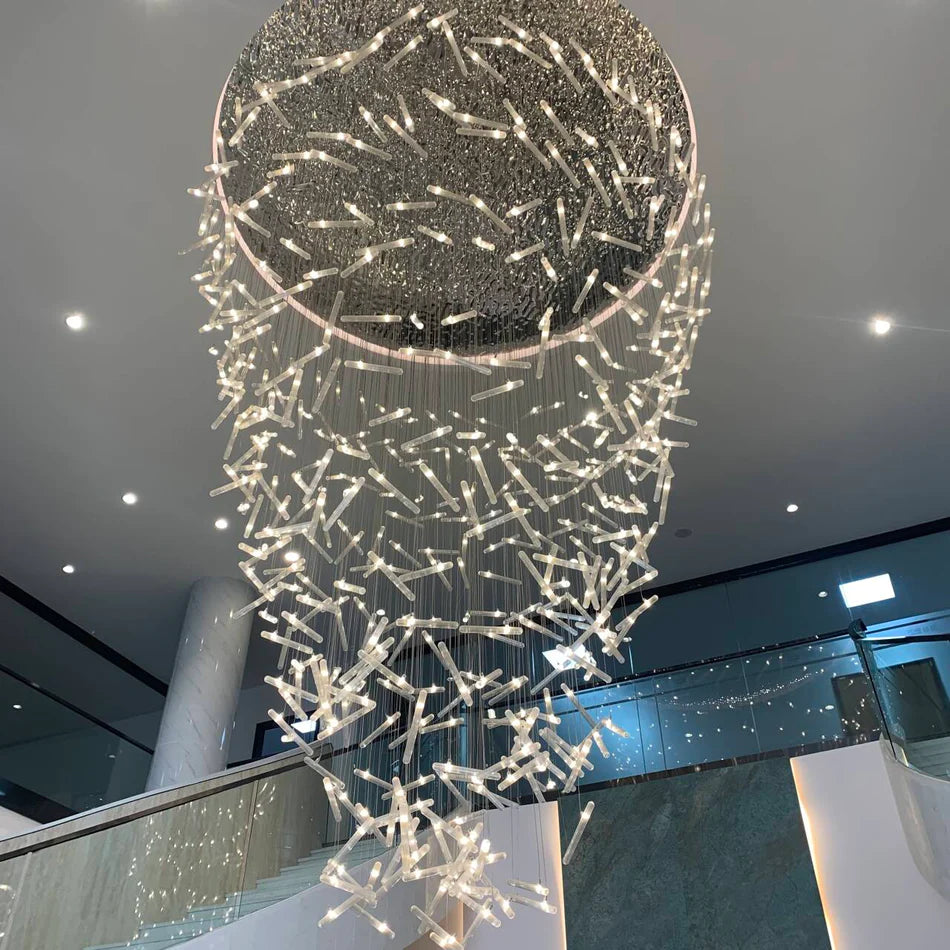 Illuminate your space with our Luxury Spiral Floating Crystal Rods Chandelier. Perfect for Staircases, Foyers, Hotels, Restaurants, and Villas, this chandelier adds a touch of elegance with its unique spiral design and sparkling crystal rods. Create a luxurious atmosphere and elevate any room with this stunning piece.