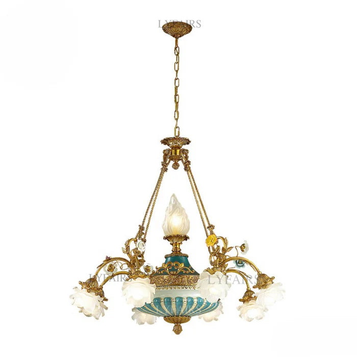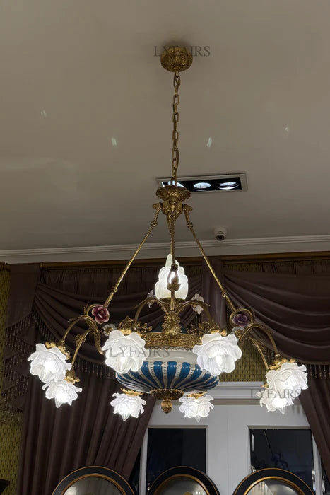 LYFAIRS x FH&Home Baroque Floral Glass Brass Chandelier with Porcelain Bottom