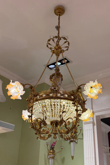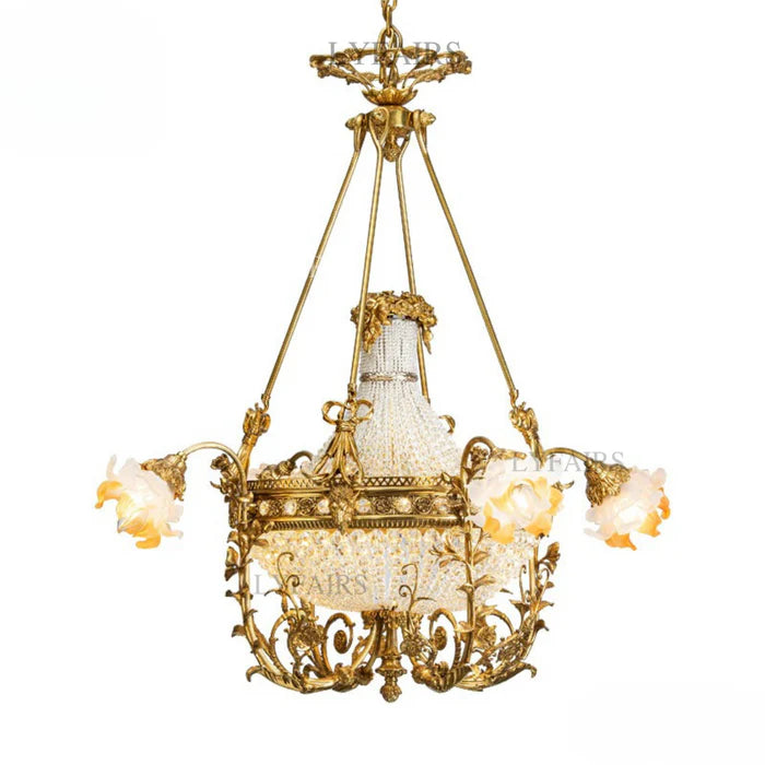 LYFAIRS x FH&Home Baroque Floral Glass Chandelier with Exquisite Brass Carved Vines