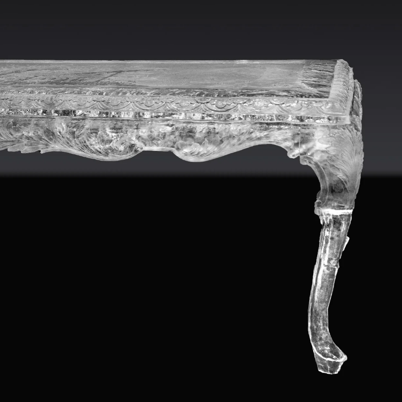 The LYFAIRS x GORDON GU Tuscany Dining Table merges traditional European elegance with innovative artistry. Featuring a tabletop crafted using a unique silk weaving technique by Chinese brocade master Jialin Li, it incorporates a delicate hand-drawn sketch of Da Vinci's ancient castle. Enhanced by the transparent clarity of Glacier Crystal, this dining table embodies a refined blend of Eastern and Western cultural heritage, creating a timeless centerpiece for sophisticated interiors.