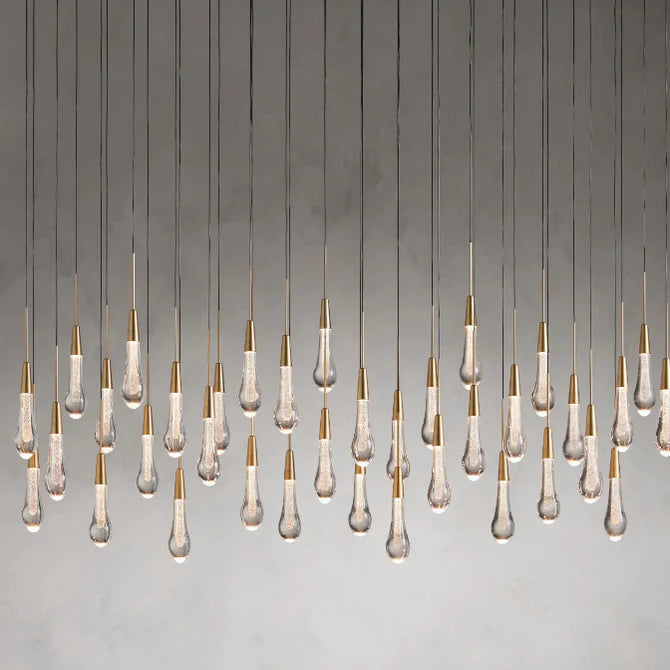 Illuminate your dining room or kitchen island with our Modern Cascade Raindrop Linear Crystal Chandelier. This handcrafted piece features adjustable black PVC cords and integrated LED lights, creating a stunning cascading effect that resembles the falling of raindrops. The seeded glass adds a touch of elegance to any space.