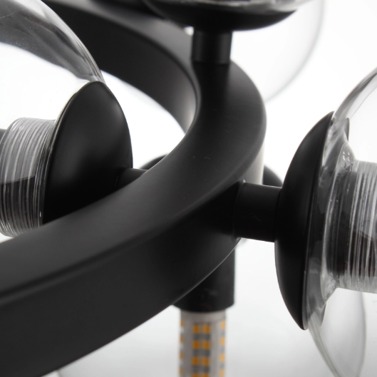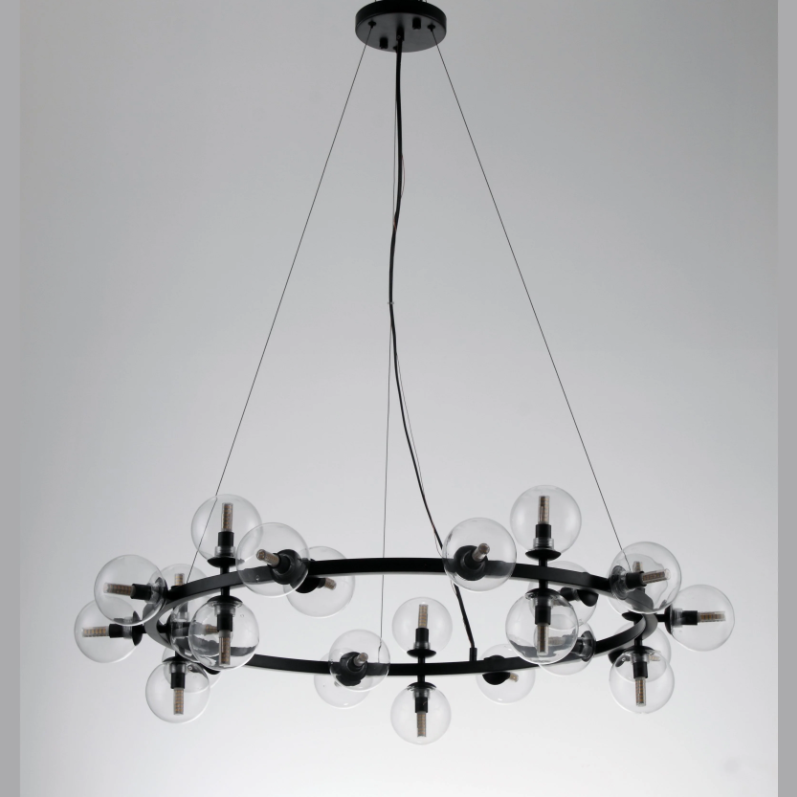 This chandelier is made of glass and metal. It is a classic black or gold metal ring decorated with multiple clear glass bulbs around the edges, with the bulbs facing up or down. The collection of clear glass bubble shades presents an appreciation of an elegant chic and sophisticated feel. The circular style can be installed in living rooms, bedrooms and other spaces.