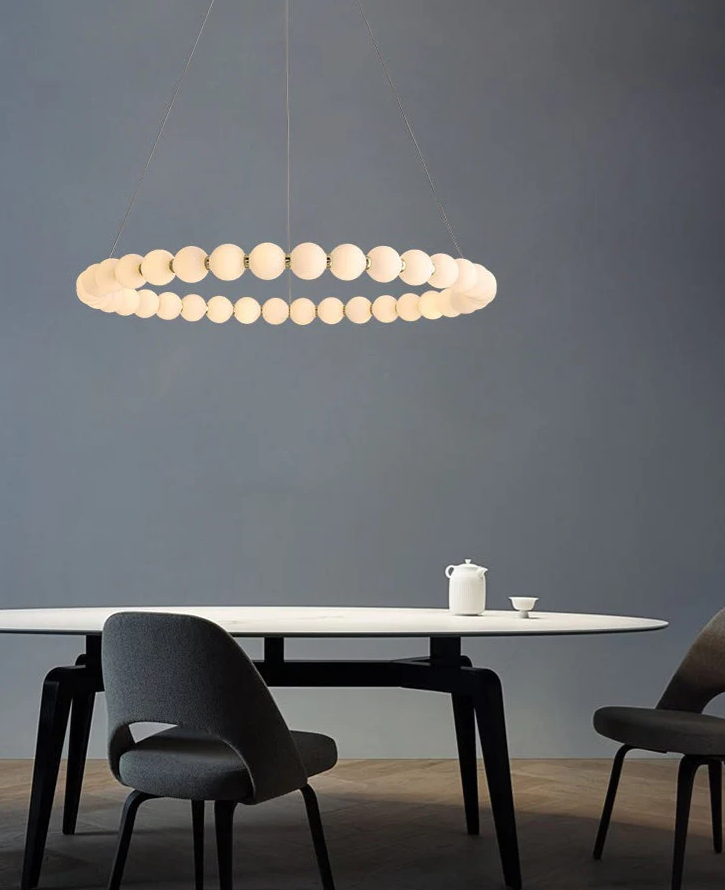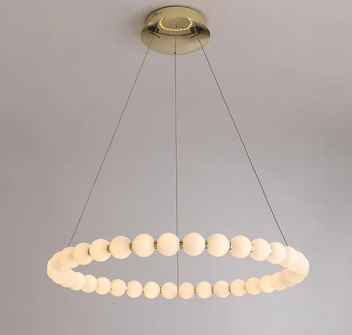 This pearl ring chandelier is made of hand-blown glass/acrylic, which gives it the bulk of the pearl ring chandelier, with brass joints and LED lights hidden inside.