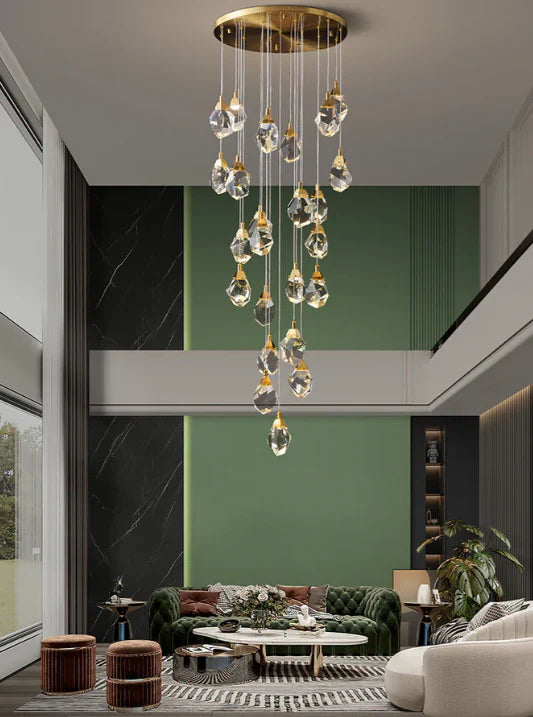 Upgrade your home with the elegant Modern Creative Crystal Prisms Stone Chandelier. Perfect for multi-level homes and villas, this chandelier adds a touch of sophistication to any staircase, foyer, or loft. Its unique crystal prisms will bring a luxurious and modern feel to your space.
