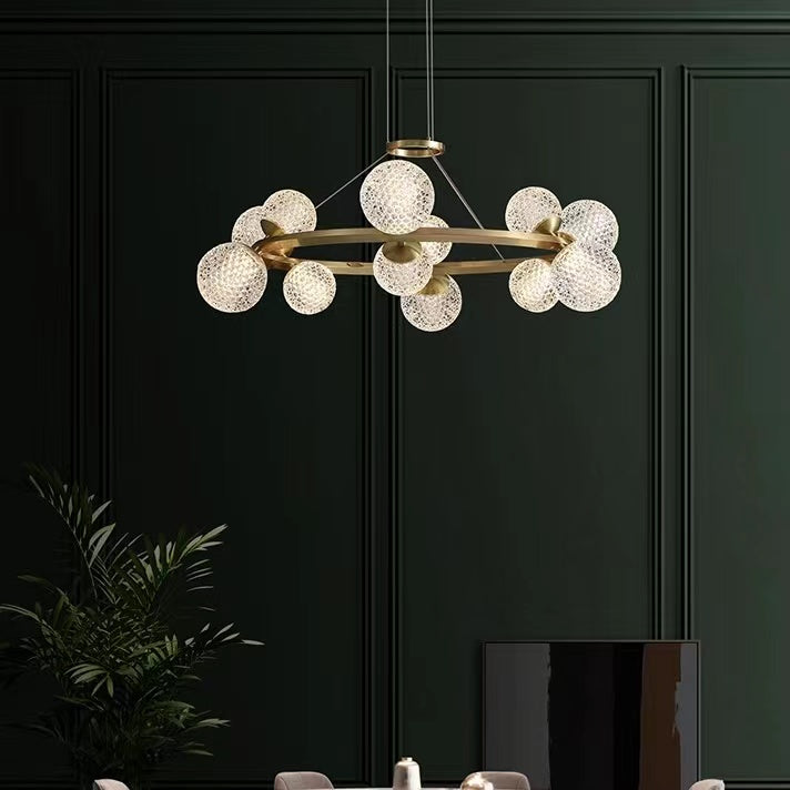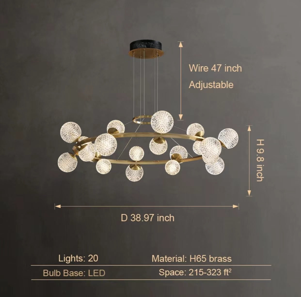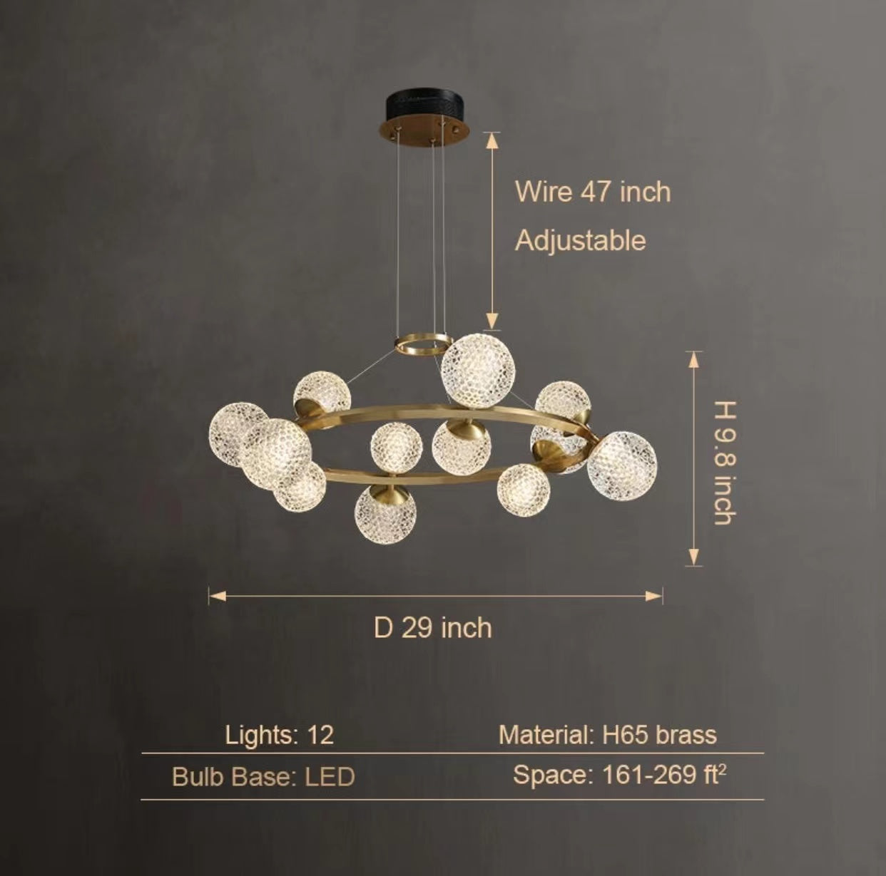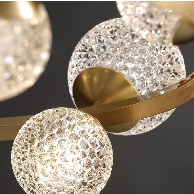 This contemporary chandelier is made of solid brass and crystal. Minimalist spirit of design, each finely faceted sphere is ground and polished by hand to reflect and refract the light. Easy to instal , Flush mounted, hardwired. Package includes all mounting hardware and instruction manual for quick and easy installation.