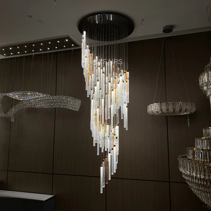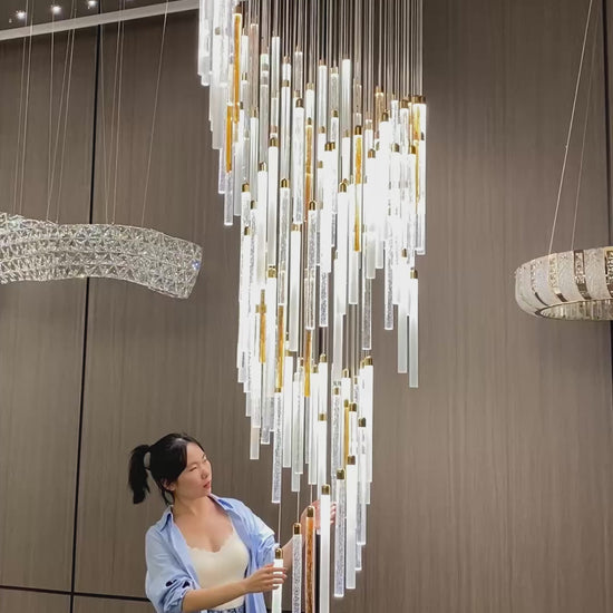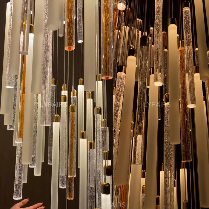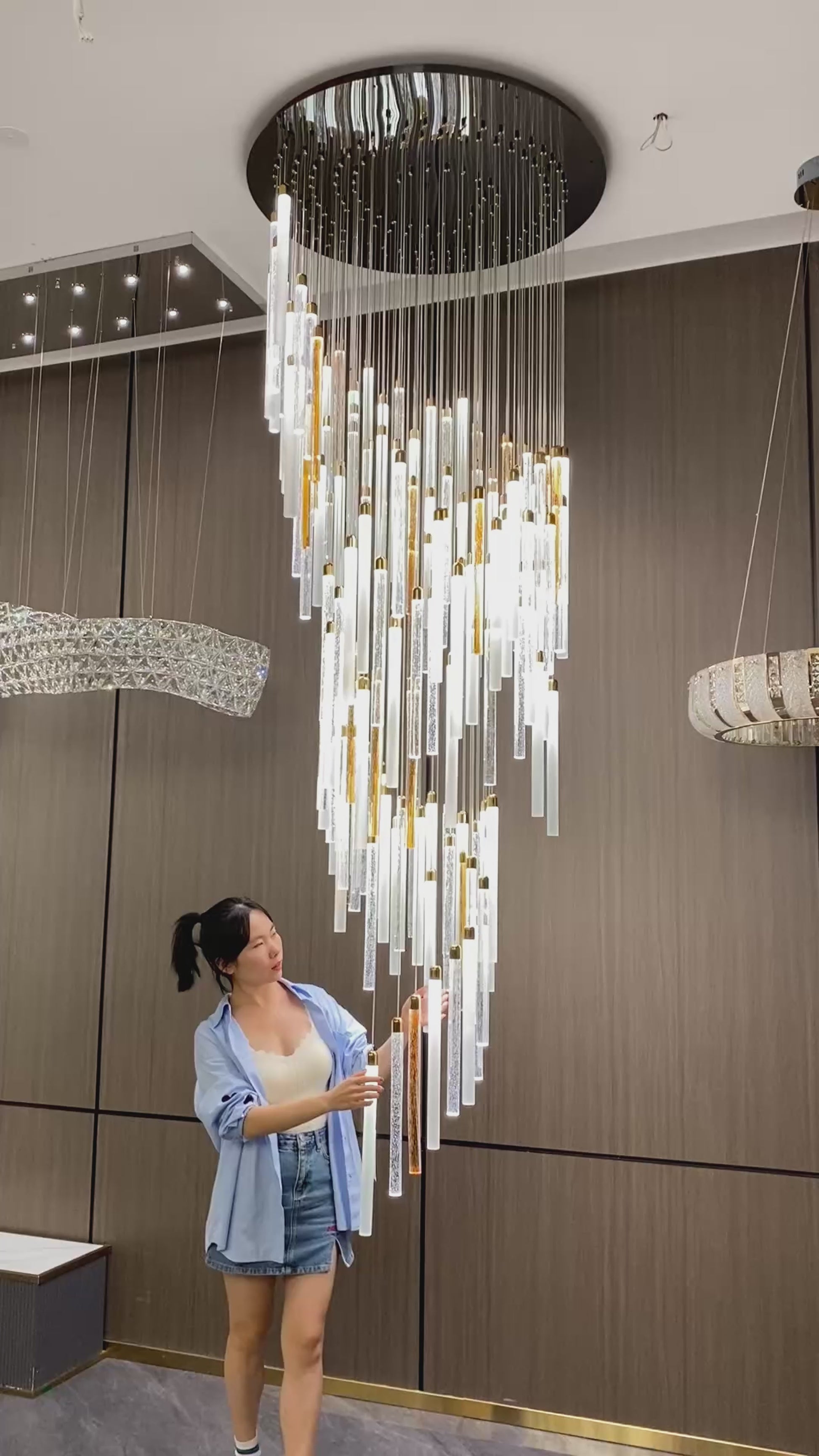 Modern Floating Clear&Orange Cylindrical Crystal Chandelier for High-ceiling