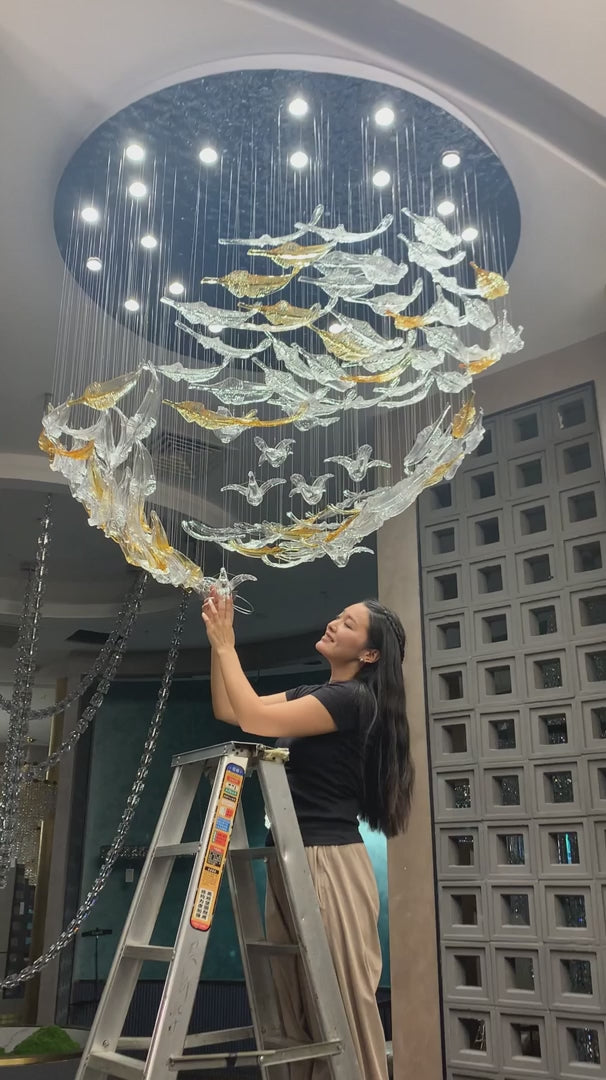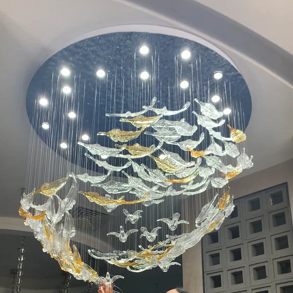 Expertly crafted with modern design, this chandelier features floating glass leaves that add a touch of creativity to any space. Perfect for staircases, foyers, or high-ceiling living rooms, this chandelier will elevate any room with its unique and sophisticated style.