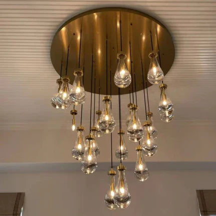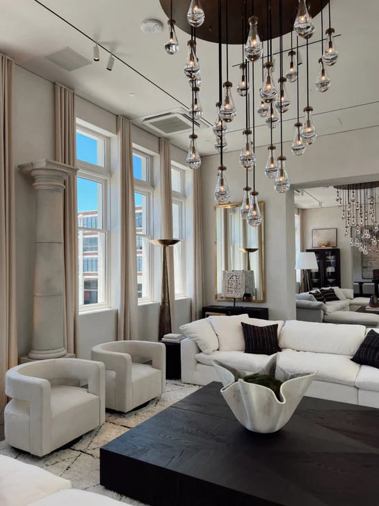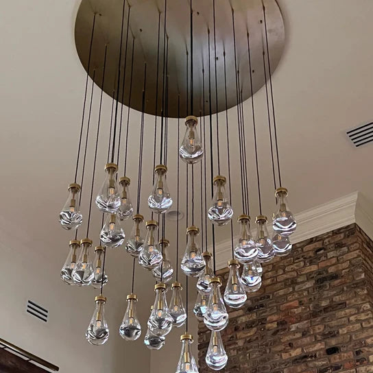 Elevate your living room, staircase, or foyer with our modern floating raindrop chandelier. Made with raindrop-shaped glass and a sturdy metal frame, this stunning piece emits a captivating underwater glow when turned on. Its unique design brings an enchanting ambiance to any room, effortlessly enhancing your space.