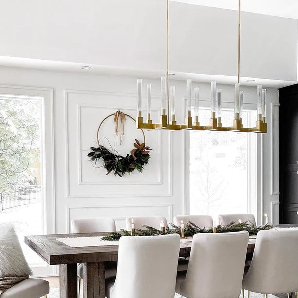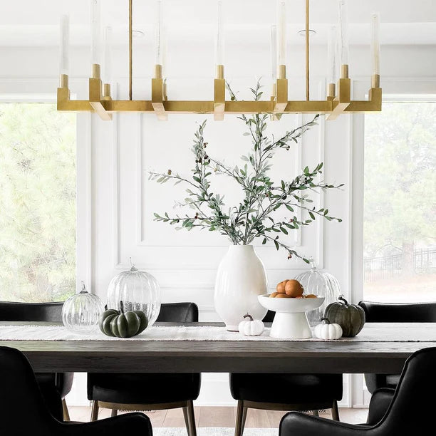 Elevate the modern feel of your dining room or kitchen island with our Linear chandelier. The sleek, angular design and clear glass shades provide a clean and minimalist aesthetic. With sturdy stems and a rectangular metal mount, this chandelier is not just stylish but also durable.