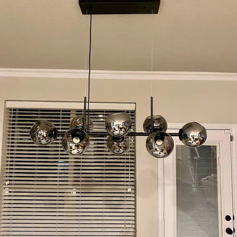 Elevate your dining room or kitchen island with our Modern Linear Smoky Gray Glass Globe Shade Chandelier. Crafted with a painted iron ceiling and glass lampshade, this chandelier not only adds aesthetic appeal but creates a cozy atmosphere for your space. Enhance your views and set the perfect mood with this stylish addition.