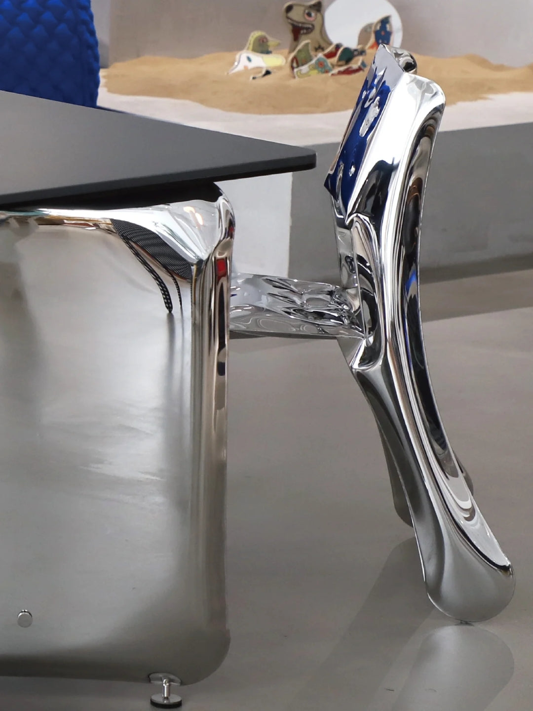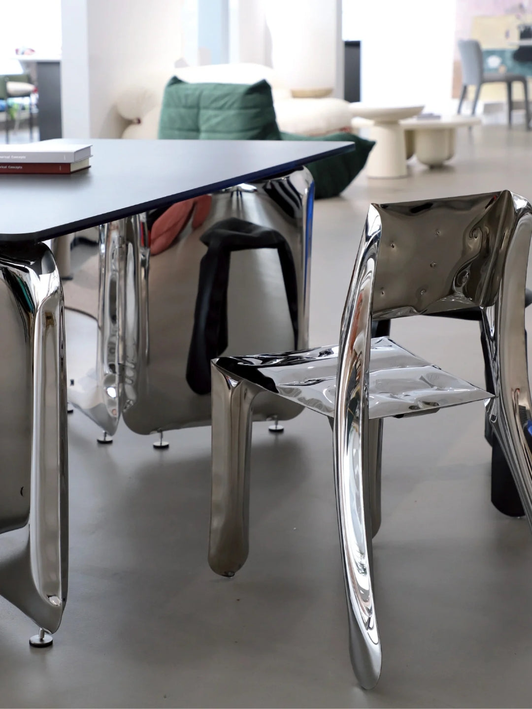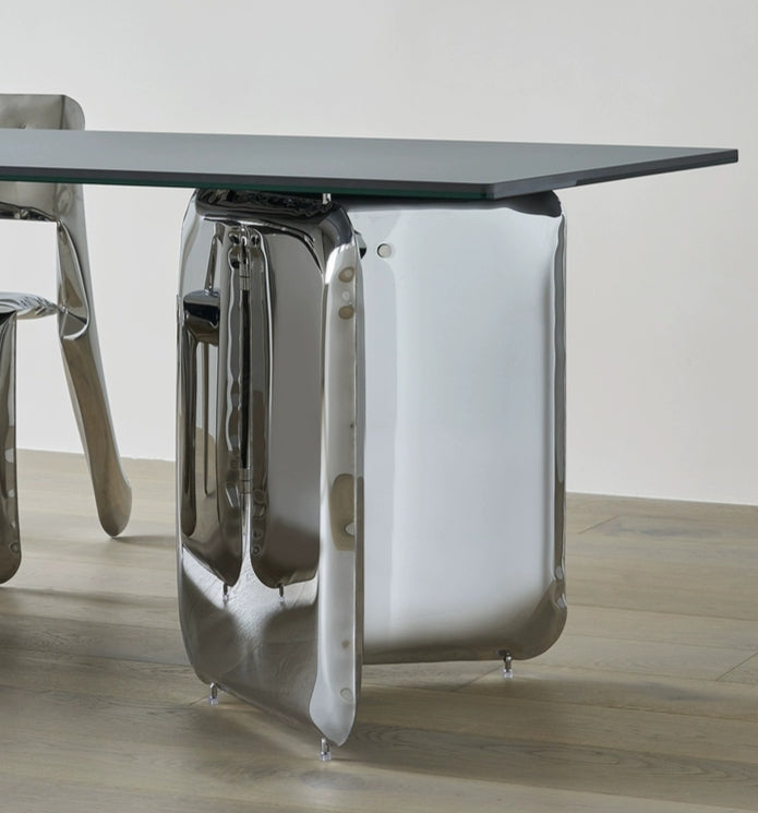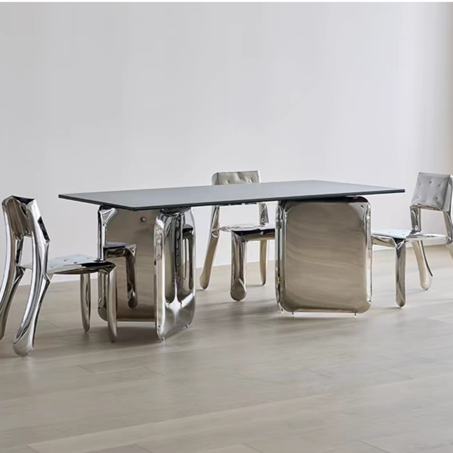 The Modern Rectangular Rock Dining Table features a sleek stainless steel leg and a durable rock tabletop. This minimalist design adds a touch of elegance to any dining space while providing a sturdy and stylish surface for meals. Bring a modern touch to your dining experience with this exceptional table.