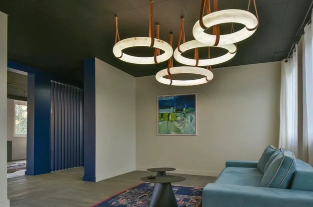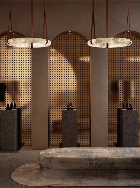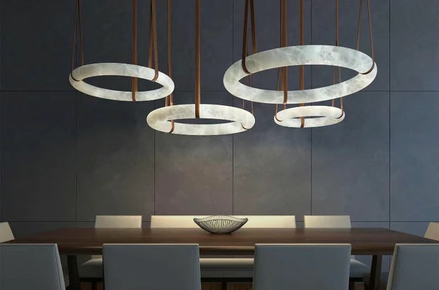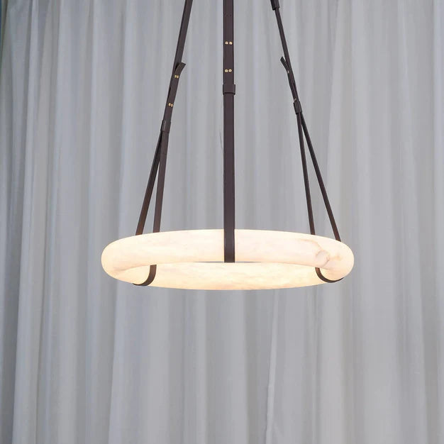 Illuminate your living room or bedroom with our Modern Round Alabaster Chandelier. The glowing alabaster ring creates a halo effect, providing a balanced and airy appearance. Individually, it brings sophistication, while in a row, it multiplies its impact. Sturdy and lightweight, it can also be hung with optional cables.