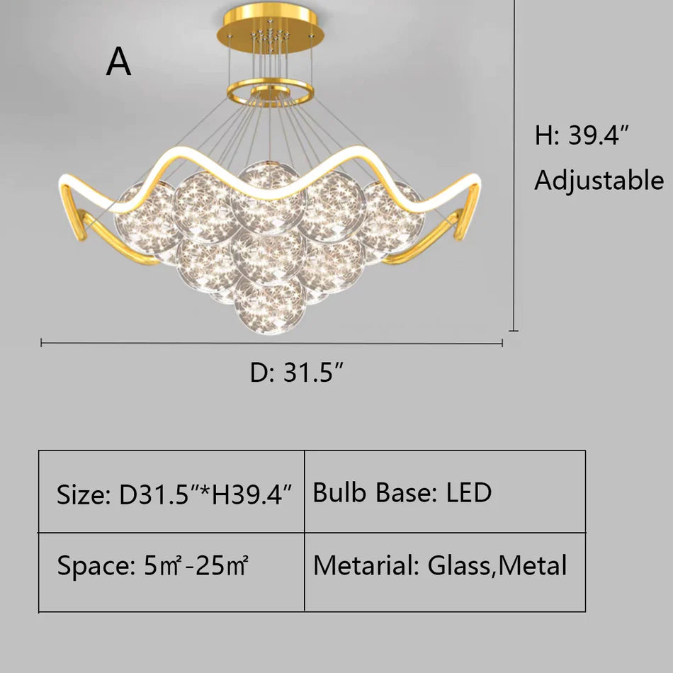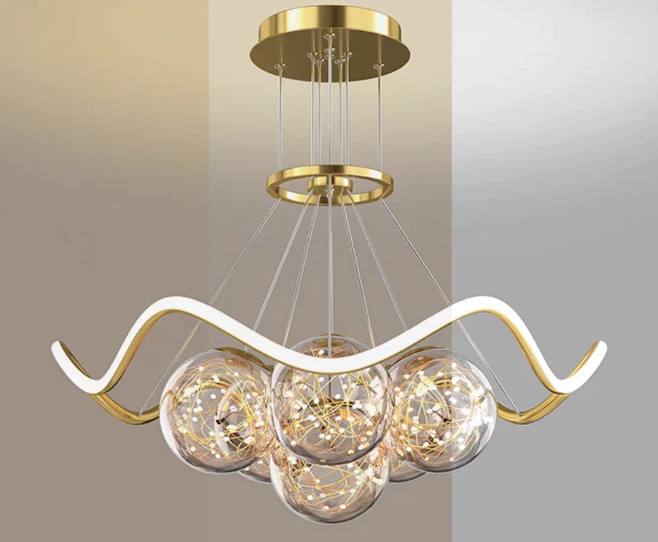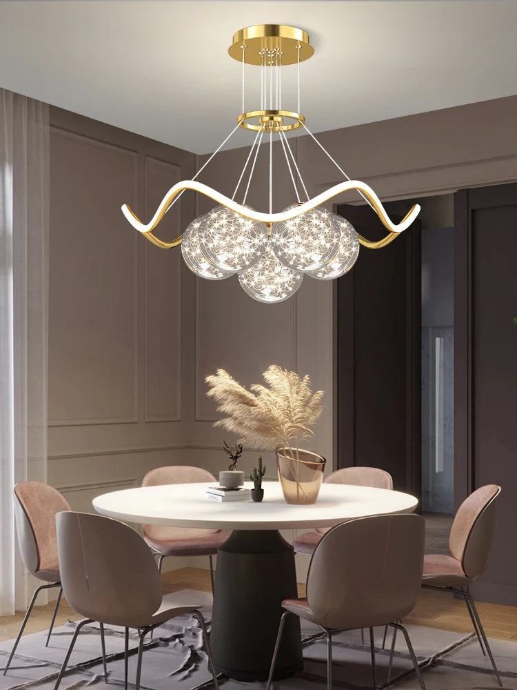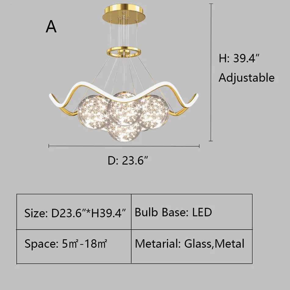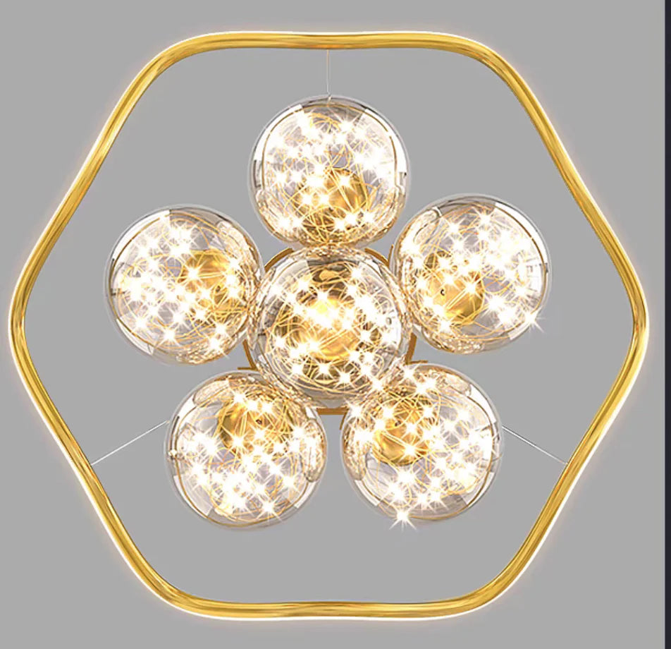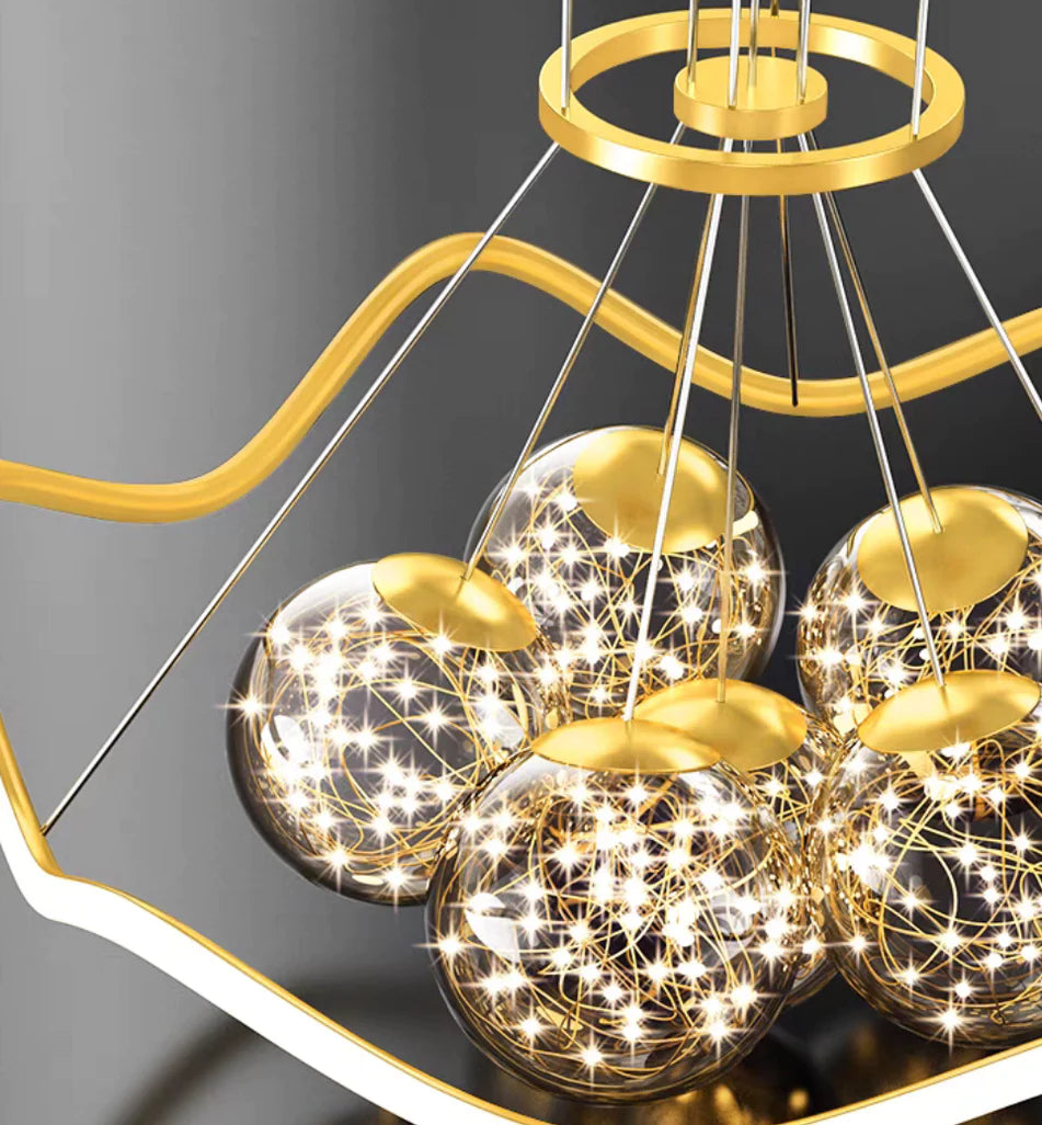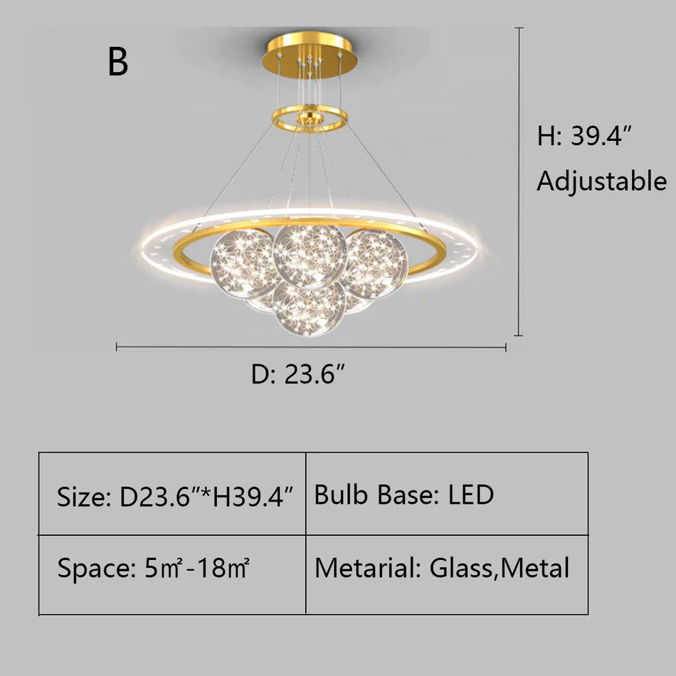 This Scandinavian modern chandelier is made of high quality glass and hardware. It is available in two styles, one with a crown-shaped hardware ring around a sky full of clear glass balls, and the other with a ring with a starry hollow design. Turn on this lamp in your room, light refraction on the ceiling, as if you can see a starry sky, giving you a romantic atmosphere. The five gold baked lacquer lamp body, showing the unique luster of metal, durable.Perfect to living room,dining table,bedroom,etc.