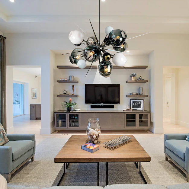 Enhance your living room or bedroom with a touch of modernity and elegance with our Modern Sputnik Glass Chandelier. Its unique and stylish design, inspired by the unconventional Sputnik shape, adds a special and sophisticated touch to any space. Made with high-quality glass, it brings a luxurious feel while providing excellent lighting, making it perfect for creating a cozy and inviting atmosphere.