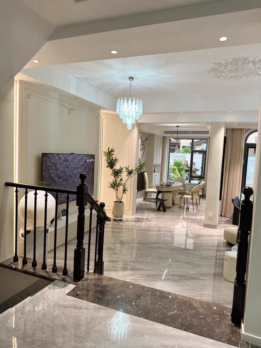 This chandelier is made of high-quality glass shade and metal, offering soft and warm illumination through it. The clever combination of hardware and glass materials creates a new expression of classical elegance.