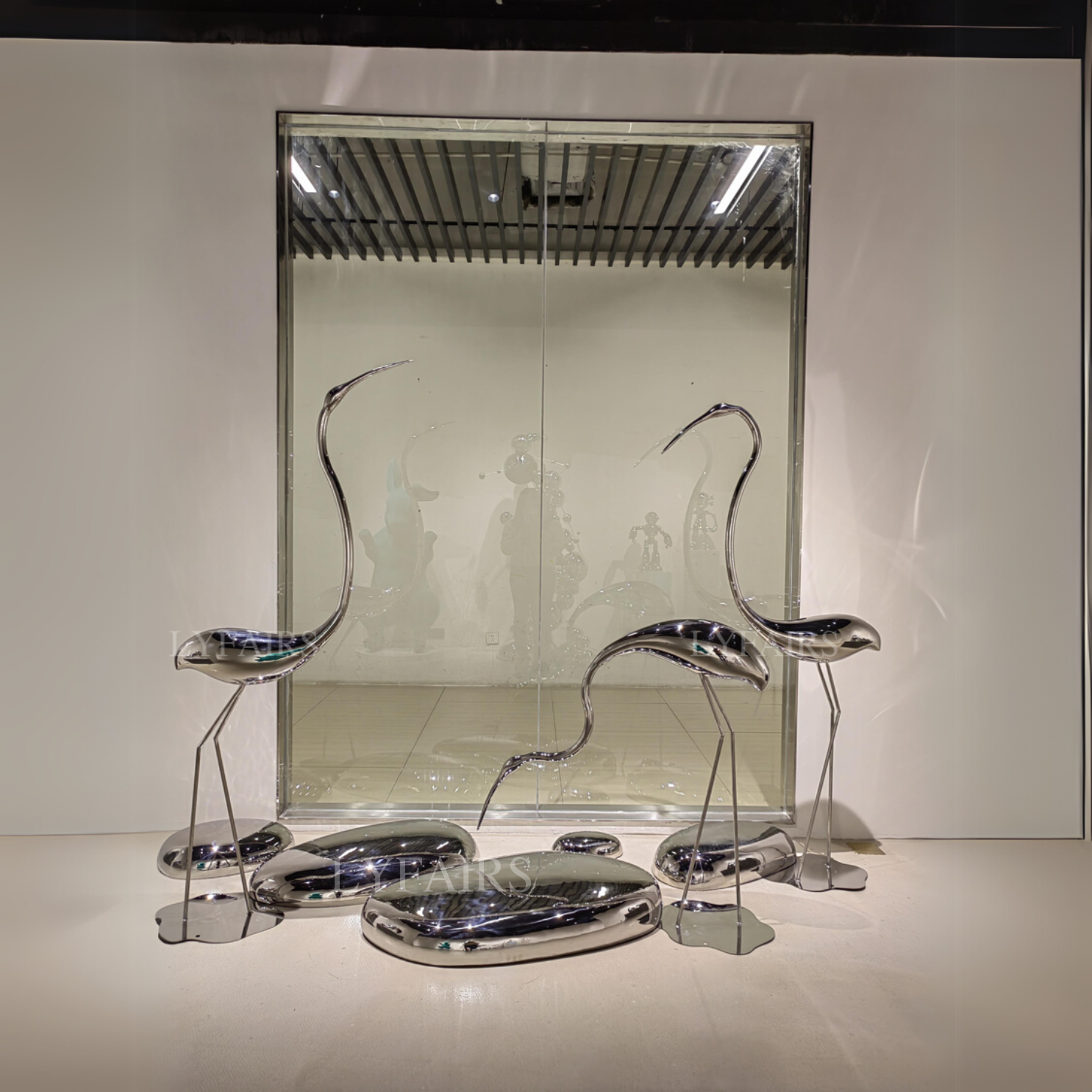 Mystical Stainless Steel Cranes and Stream Stones Artwork Sculpture