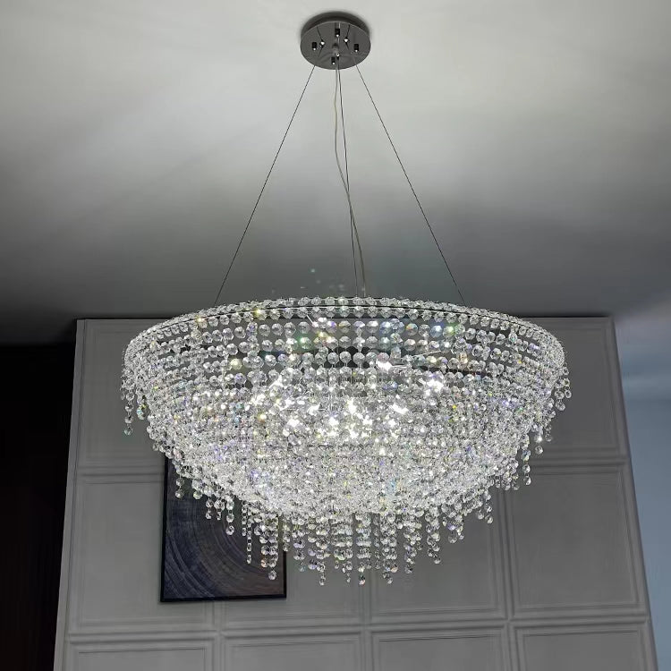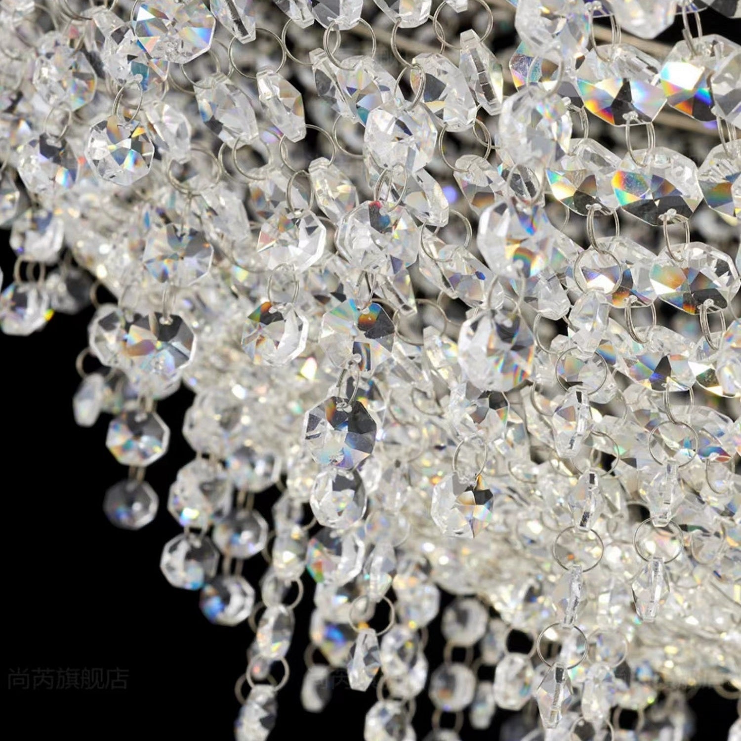 This chandelier is made of high quality crystal and metal, it consists of a single crystal forming a hemisphere shape, like an inverted dome. The jewels at the bottom are arranged in short sparkling chains, presenting a luxurious and elegant atmosphere suitable for a variety of applications, including living room/bedroom/dining room, etc. It is absolutely stunning whether the lights are on or not.