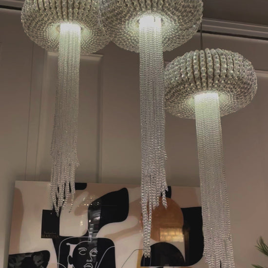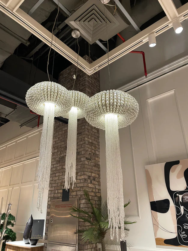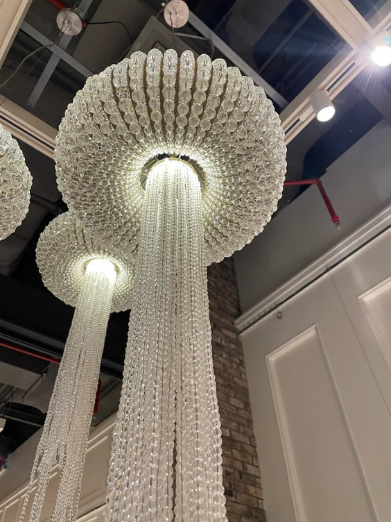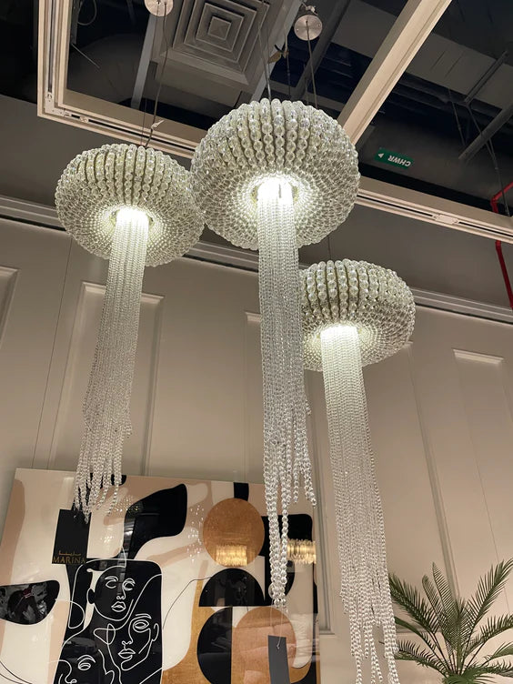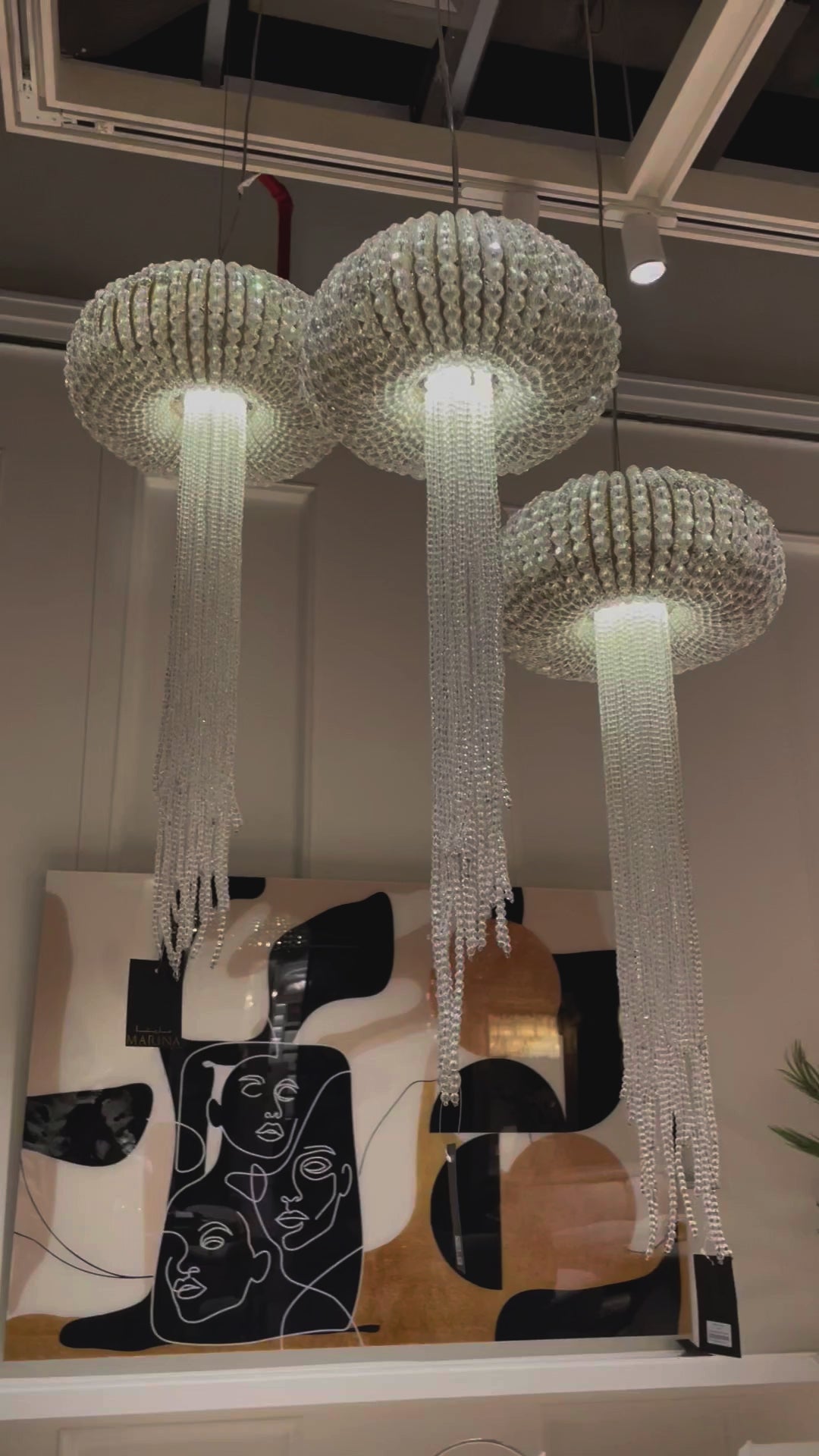 Inspired by the sea spirit jellyfish, this sling is mysterious and elegant. It is made of high-quality crystal material, which is crafted into a crystal bead, and they are then strung together to form this stunning artwork. Recommend the size of the two together with the installation, enough to light up the entire dining room area, or as the main light in the living room, bedroom lights, are very good choices. When used alone can be used as a study, checkroom art chandelier. It is absolutely stunning whether the light is on or off.