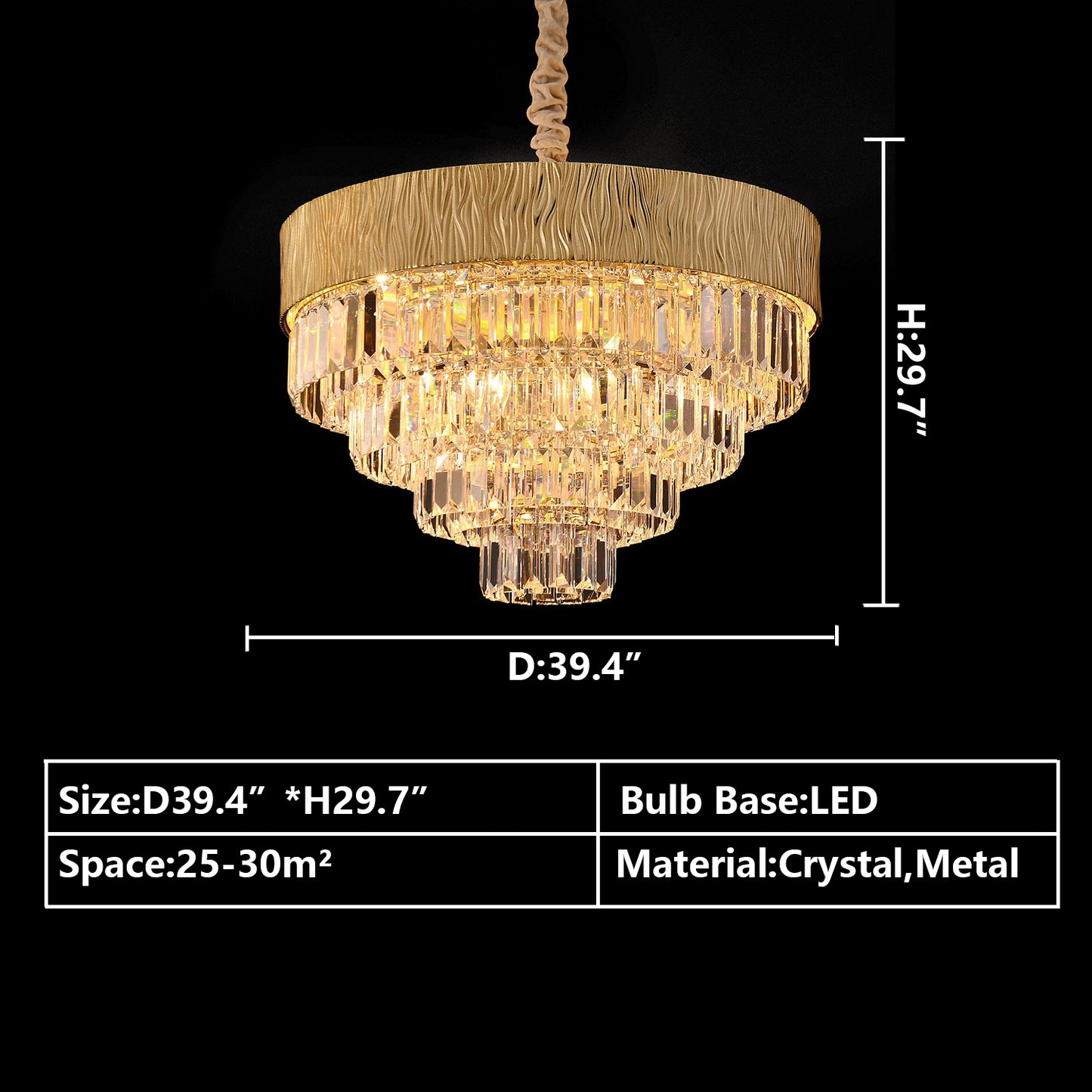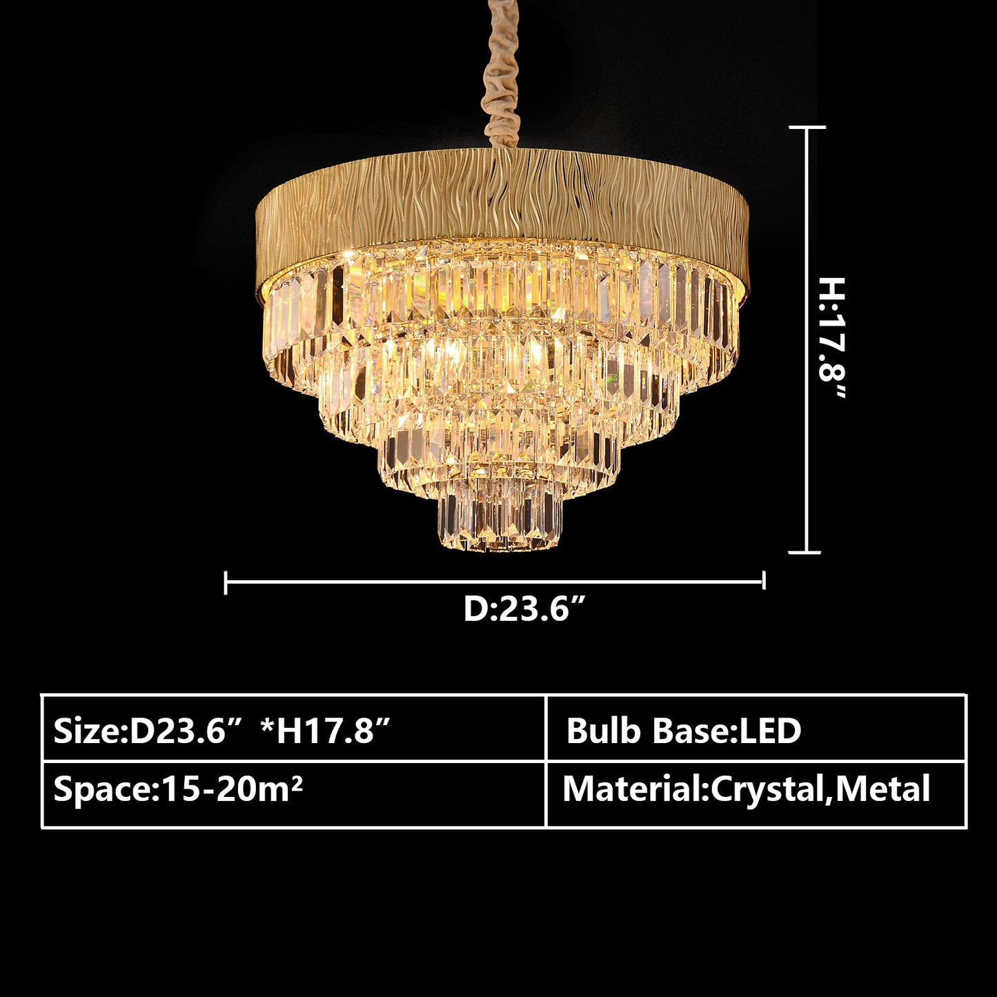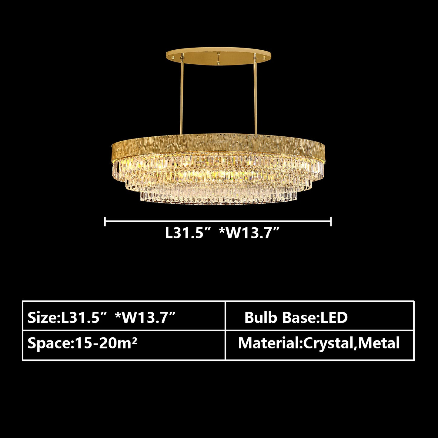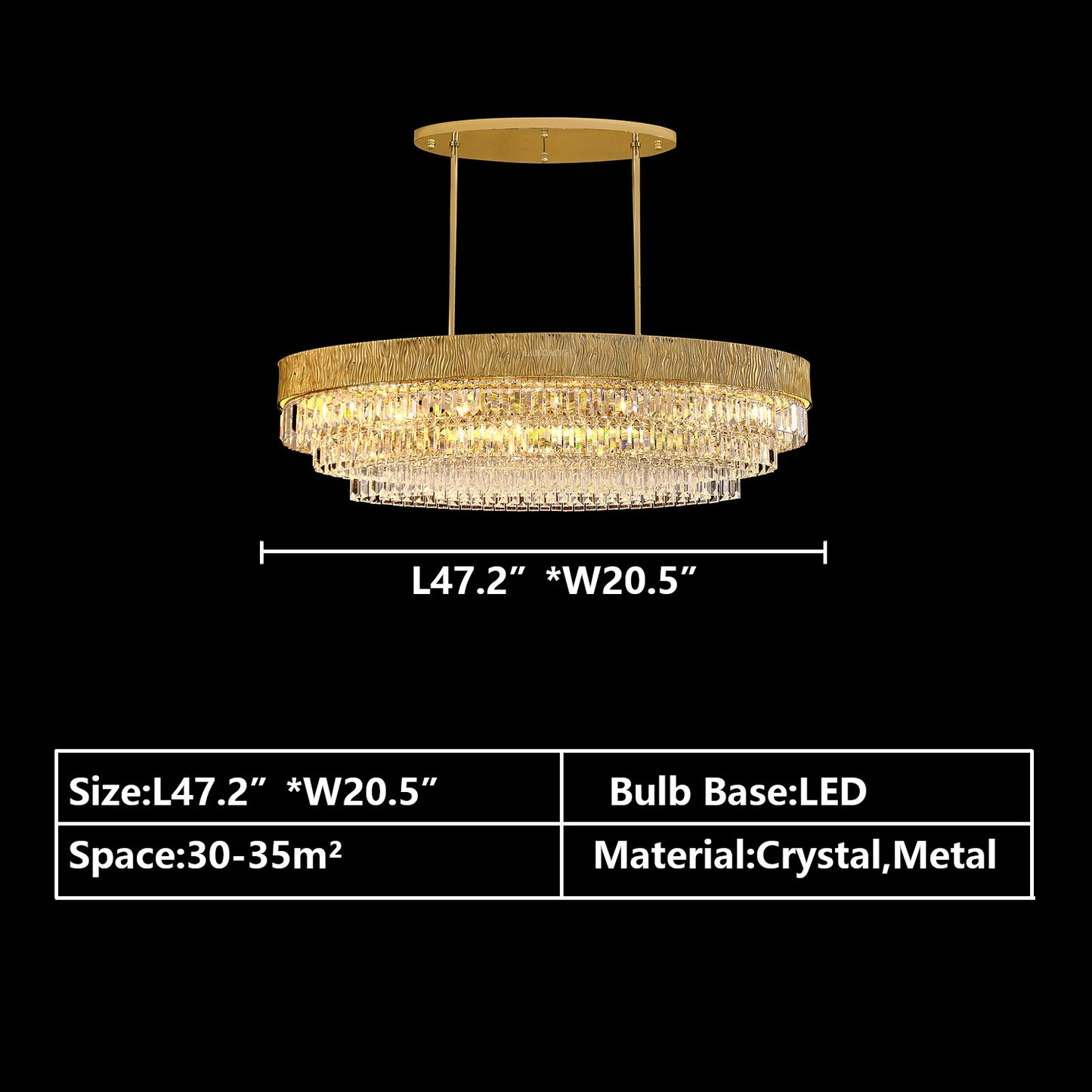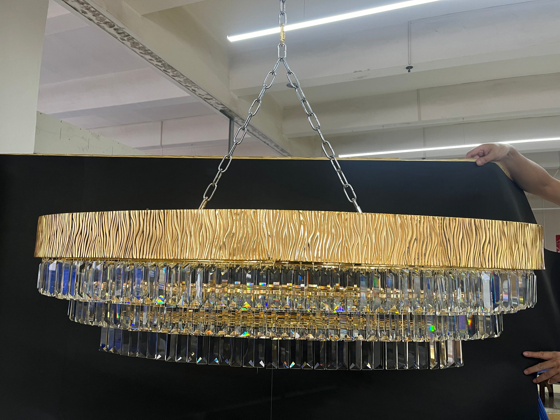 This set of crystal chandelier is made of high quality k9 crystal and gold hardware body, the gold crystal bars are neatly arranged to form a rounded circle in turn, the unconventional hardware body is also carved with inconsistent patterns, making this lamp look high class and textured, there are two shapes to choose from, round and oval, to meet your whole house with the needs, and provide many sizes, you can also customize the lamp according to the size of your space accordingly.