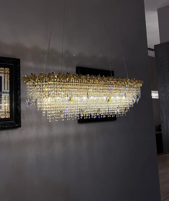 The new crystal chandelier is made of high-quality crystals and hardware, simulation hardware flowers are vividly inlaid on the surface of the lamp body, with clear crystal beads and crystal bars, the butterfly pendant in the crystal hidden, this chandelier design with a sense of art at the same time the pursuit of vitality and vitality, whether hanging above the dining table or decorated in the kitchen long island table, can meet the demand for illumination at the same time to add elegance and advanced beauty for your space.