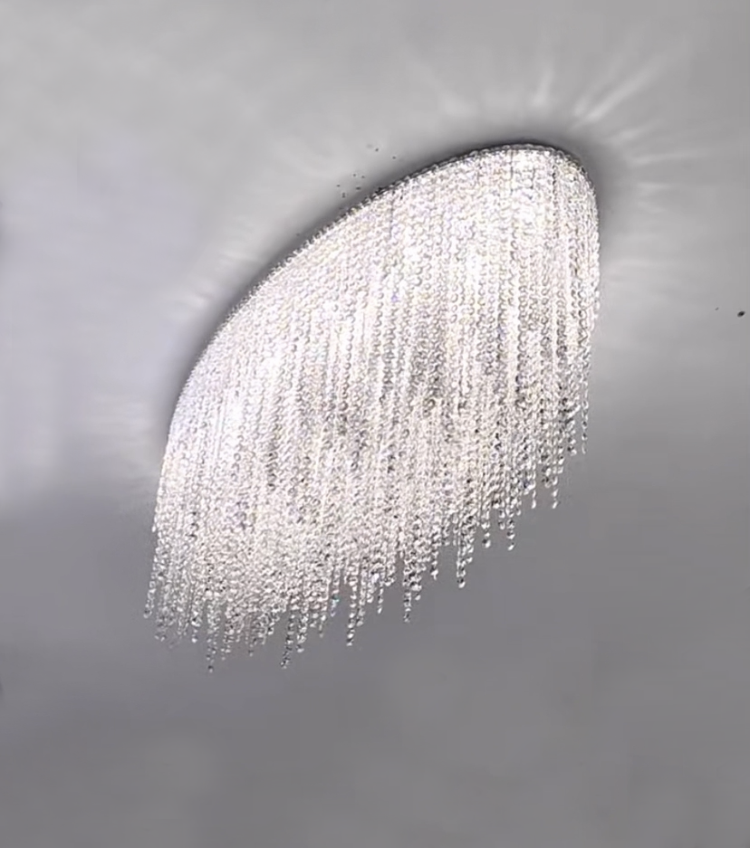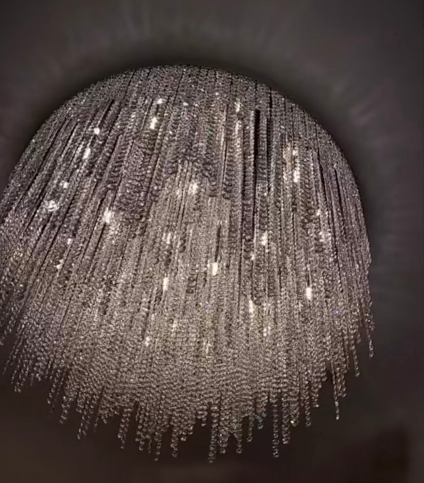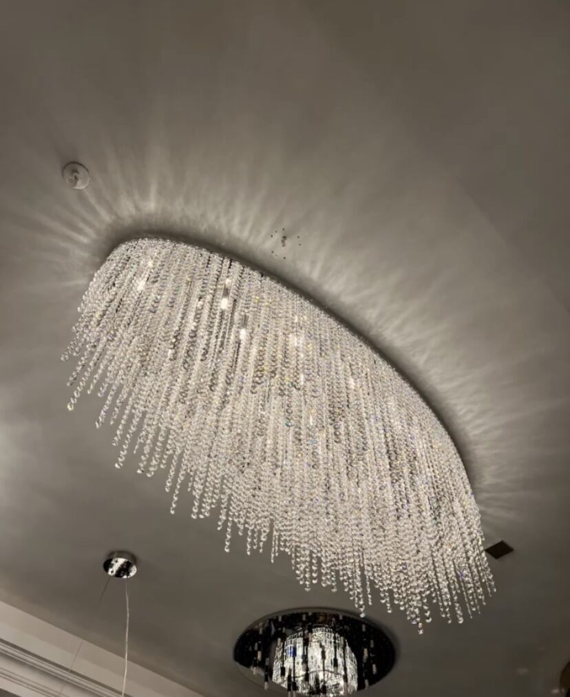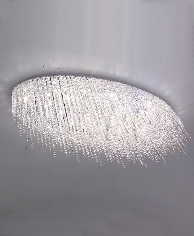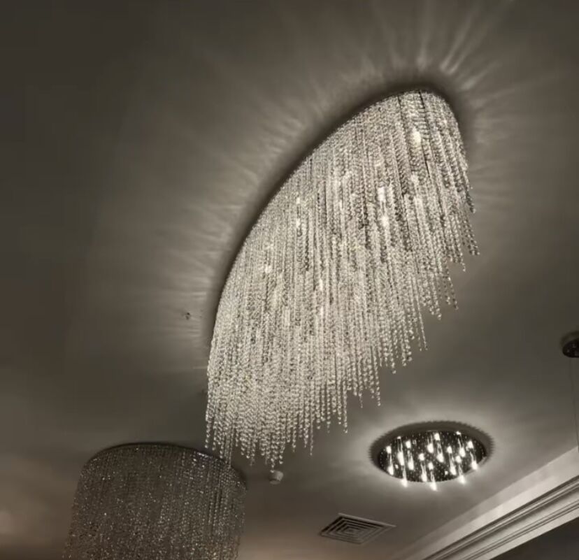 This modern light luxury crystal tassel chandelier set, a round and oval chassis gives this lamp two different shapes, simple appearance with dazzling crystal beads tassel, like a rain of light falling from the ceiling, beautiful and elegant, this lamp offers a variety of sizes, can meet your different space needs, whether home decoration or commercial decoration is a very perfect highlight.