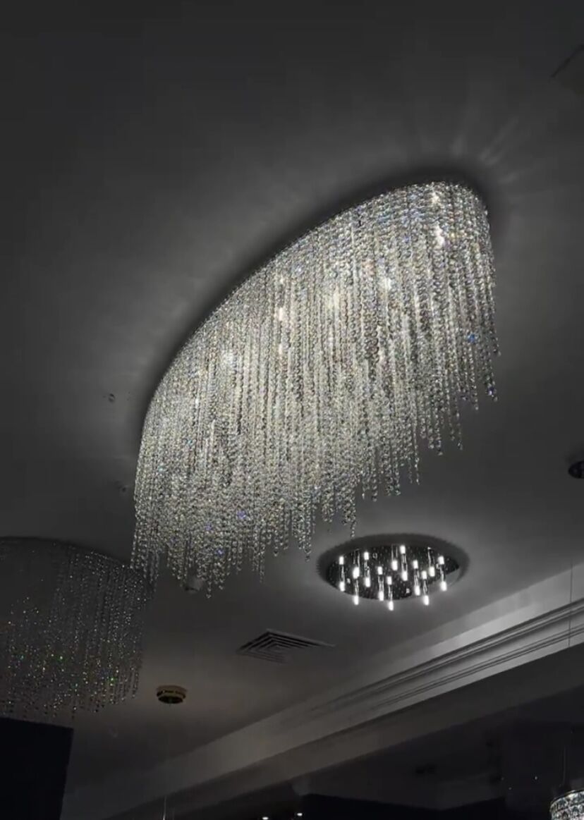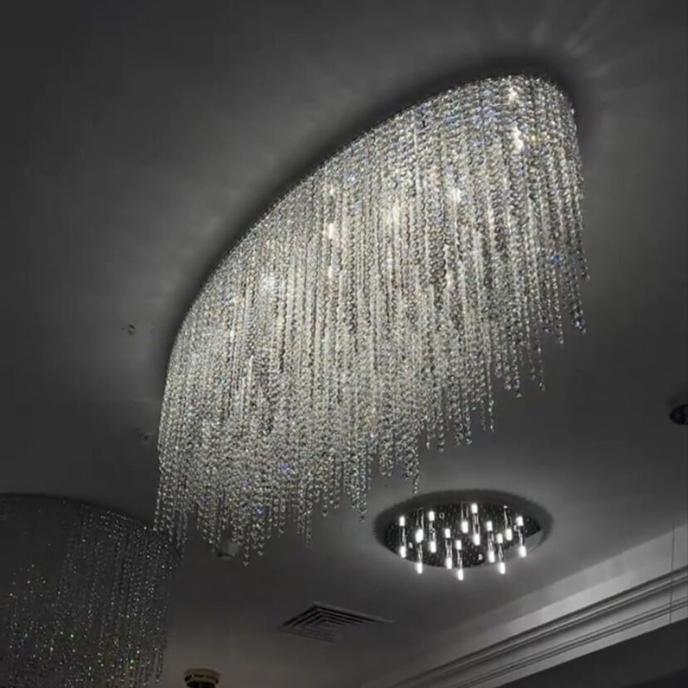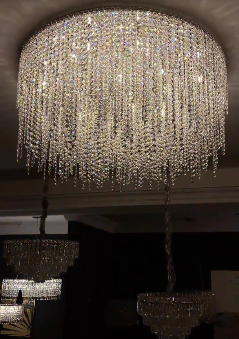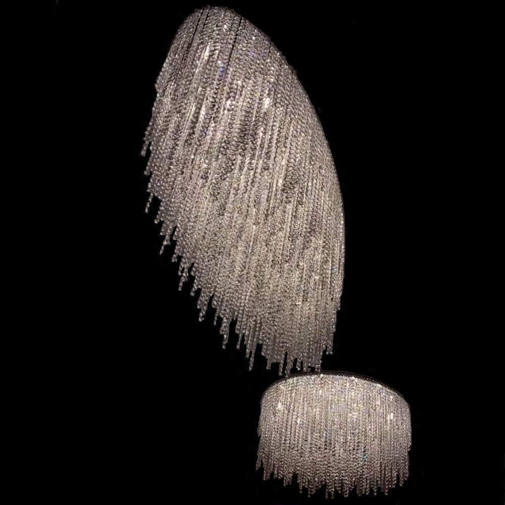 This modern light luxury crystal tassel chandelier set, a round and oval chassis gives this lamp two different shapes, simple appearance with dazzling crystal beads tassel, like a rain of light falling from the ceiling, beautiful and elegant, this lamp offers a variety of sizes, can meet your different space needs, whether home decoration or commercial decoration is a very perfect highlight.