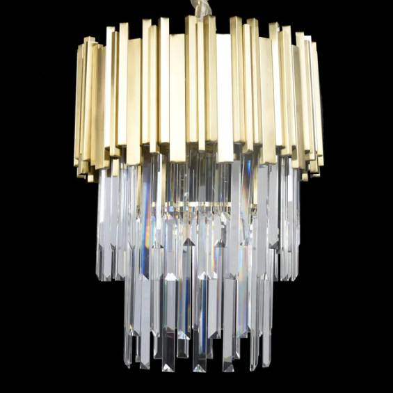 This pendant is made of crystal and metal.The multi-layered metal mixed with crystal is sparkling from every angle and absolutely stunning when the lights are switched on. The brass finish and high quality crystals give this artefact a consistently good shine and a rich colour whose colour never fades. Ideal for luxurious dining rooms, kitchen islands, bedrooms and more.