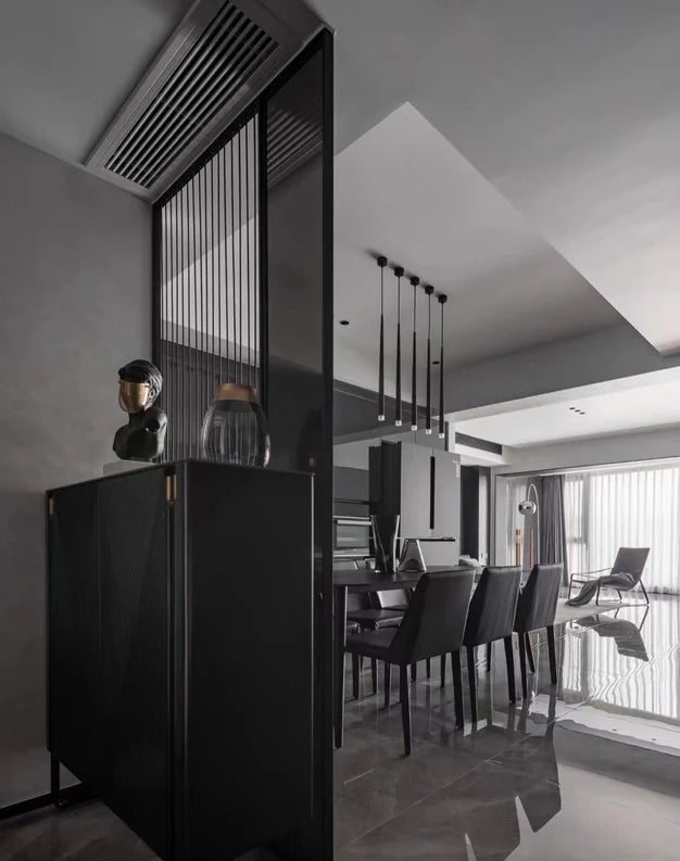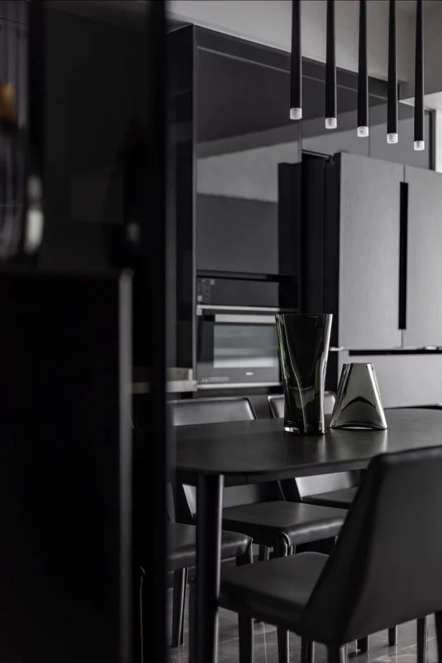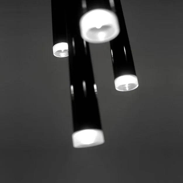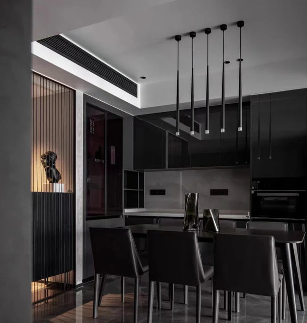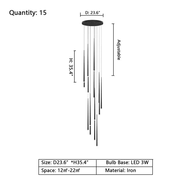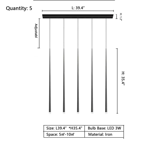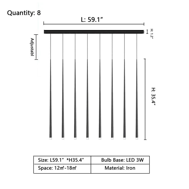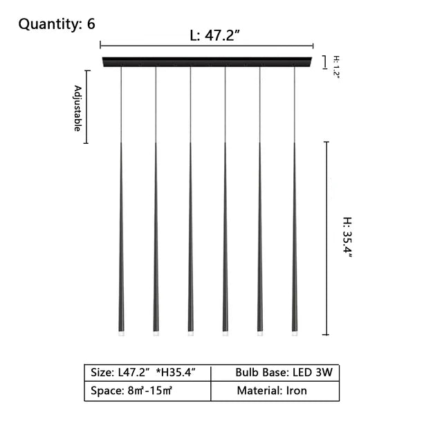 The body of this minimalist conical chandelier is made of iron, and the color of the body is made into a high-class black through the process of painting and frosting, which is anti-corrosion and rust-proof and durable. This chandelier is divided into a round chassis and a rectangular chassis, round chassis models for stairs or high floors of the living room, and rectangular chassis can be used to decorate the dining room or set in the bed for night lighting.